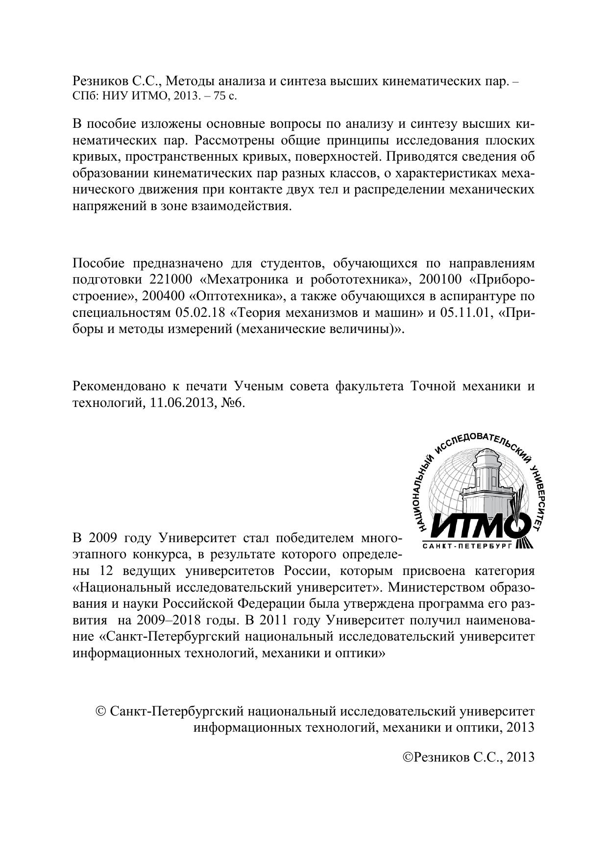 В пособие изложены основные вопросы по анализу и синтезу высших кинематических пар. Рассмотрены общие принципы исследования плоских кривых, пространственных кривых, поверхностей. Приводятся сведения об образовании кинематических пар разных классов, о характеристиках механического движения при контакте двух тел и распределении механических напряжений в зоне взаимодействия.