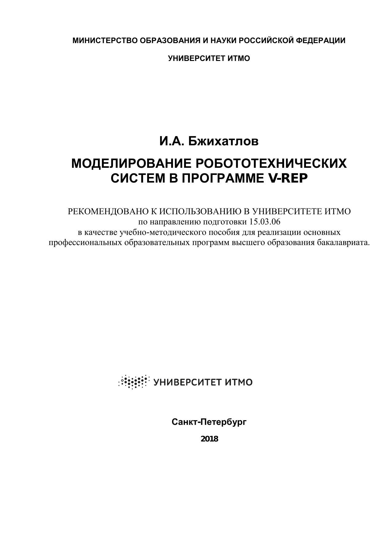 Данное учебно-методическое пособие раскрывает вопросы моделирования робототехнических систем в программе V-REP и дает навыки моделирования процесса работы робототехнических и мехатронных комплексов с учетом законов физики. Данное пособие затрагивает в большей или меньшей степени такие области науки, как механика, управление и программирование. В пособии приведены примеры реализации наиболее часто встречающихся робототехнических систем. Методическое пособие предназначено для студентов, обучающихся на факультете систем управления и робототехники по направлению 15.03.06 Мехатроника и робототехника, уже прошедших курсы по механике, основам программирования и теории управления в технических системах.