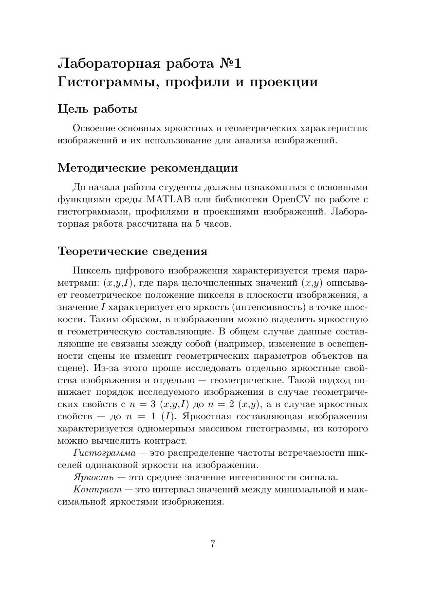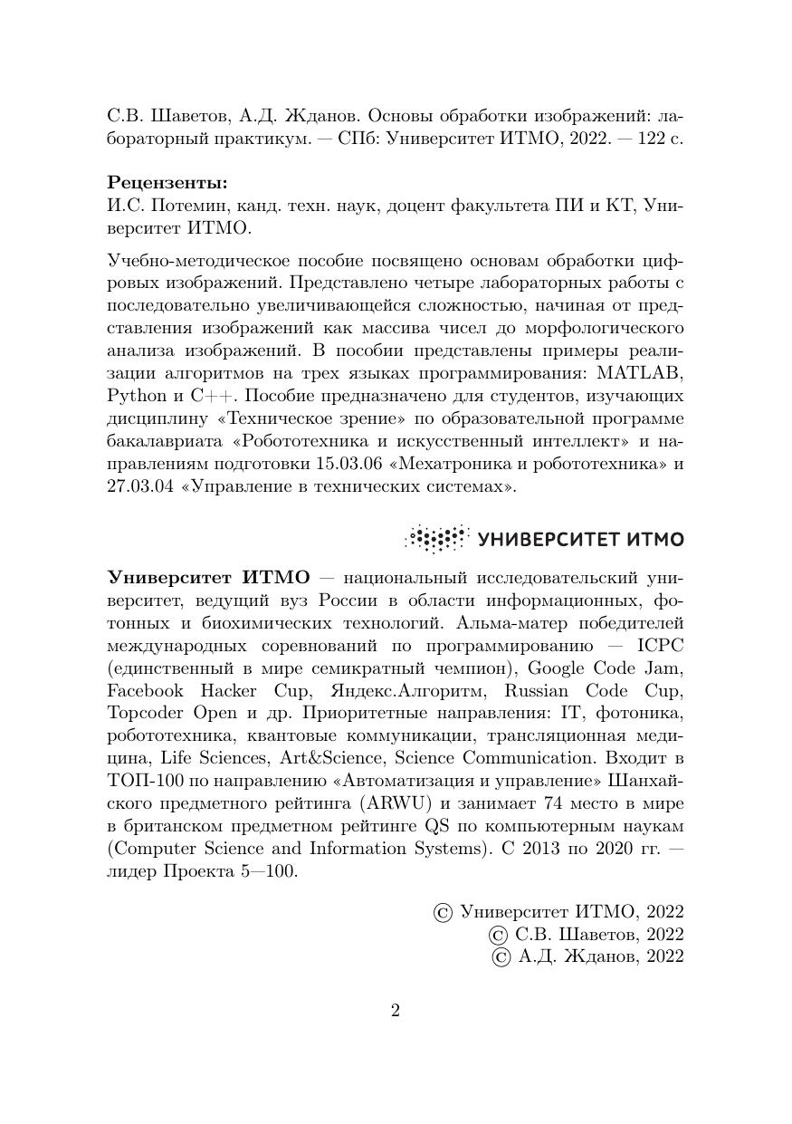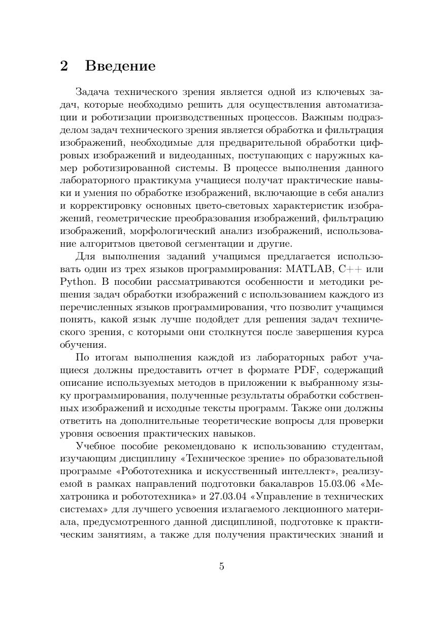 Учебно-методическое пособие посвящено основам обработки цифровых изображений. Представлено четыре лабораторных работы с последовательно увеличивающейся сложностью, начиная от представления изображений как массива чисел до морфологического анализа изображений. В пособии представлены примеры реализации алгоритмов на трех языках программирования: MATLAB, Python и C++. Пособие предназначено для студентов, изучающих дисциплину «Техническое зрение» по образовательной программе бакалавриата «Робототехника и искусственный интеллект» и направлениям подготовки 15.03.06 «Мехатроника и робототехника» и 27.03.04 «Управление в технических системах».