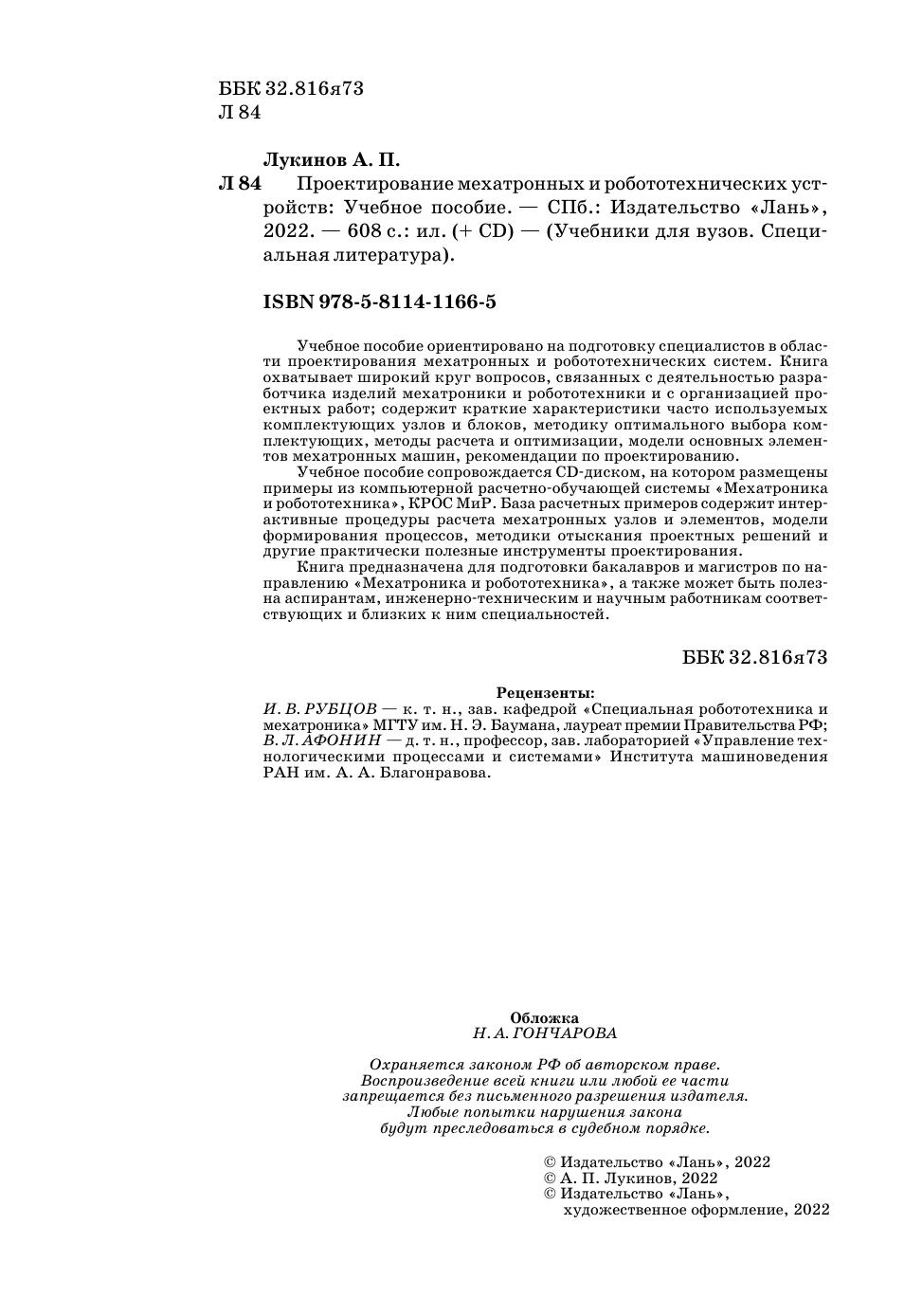 Учебное пособие ориентировано на подготовку специалистов в области проектирования мехатронных и робототехнических систем. Книга охватывает широкий круг вопросов, связанных с деятельностью разработчика изделий мехатроники и робототехники и с организацией проектных работ, содержит краткие характеристики часто используемых комплектующих узлов и блоков, методику оптимального выбора комплектующих, методы расчета и оптимизации, модели основных элементов мехатронных машин, рекомендации по проектированию. Учебное пособие сопровождается CD-диском, на котором размещены примеры из компьютерной расчетно-обучающей системы «Мехатроника и робототехника», КРОС МиР. База расчетных примеров содержит интерактивные процедуры расчета мехатронных узлов и элементов, модели формирования процессов, методики отыскания проектных решений и другие практически полезные инструменты проектирования. Книга предназначена для подготовки бакалавров и магистров по направлению «Мехатроника и робототехника», а также может быть полезна аспирантам, инженерно-техническим и научным работникам соответствующих и близких к ним специальностей.