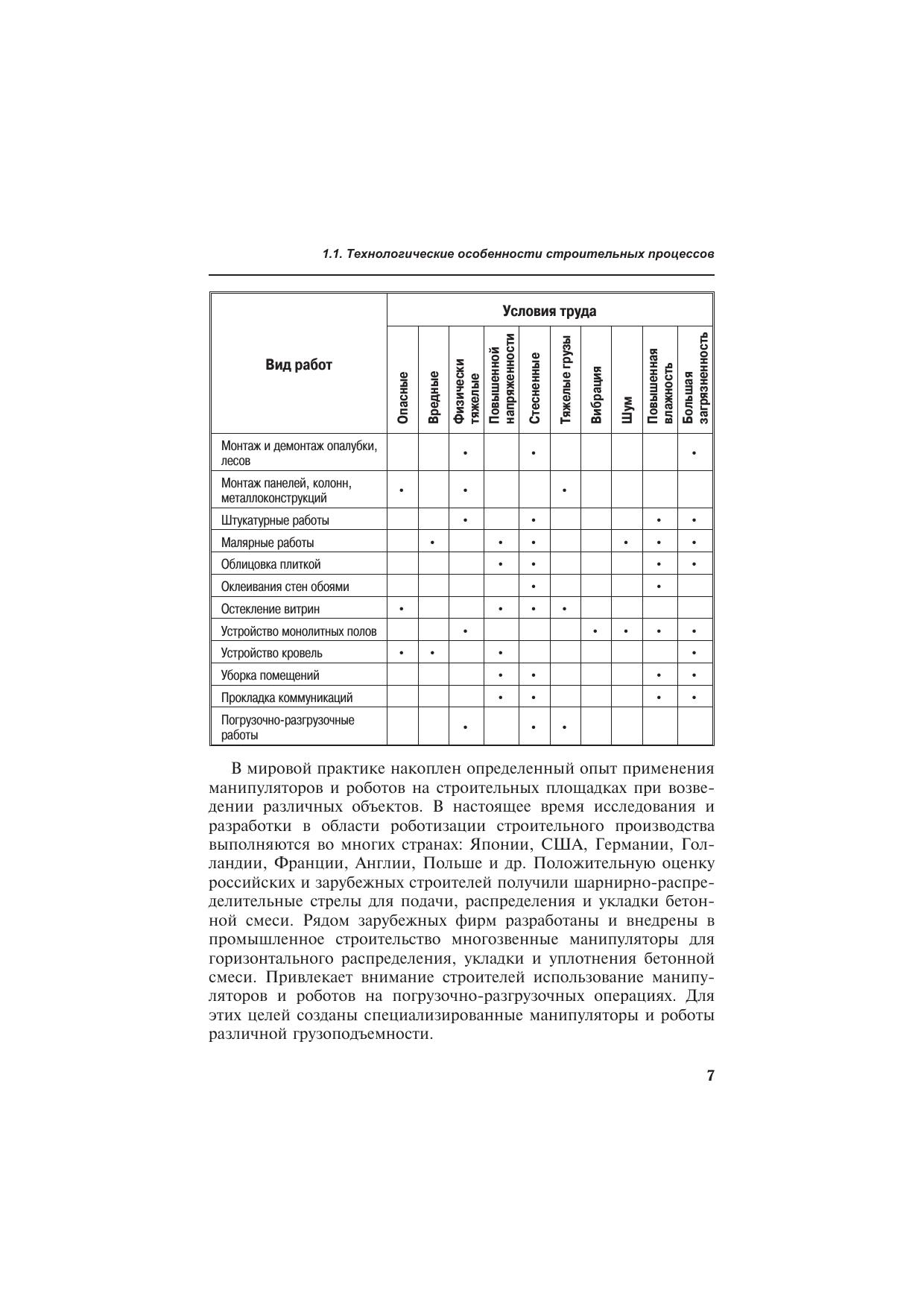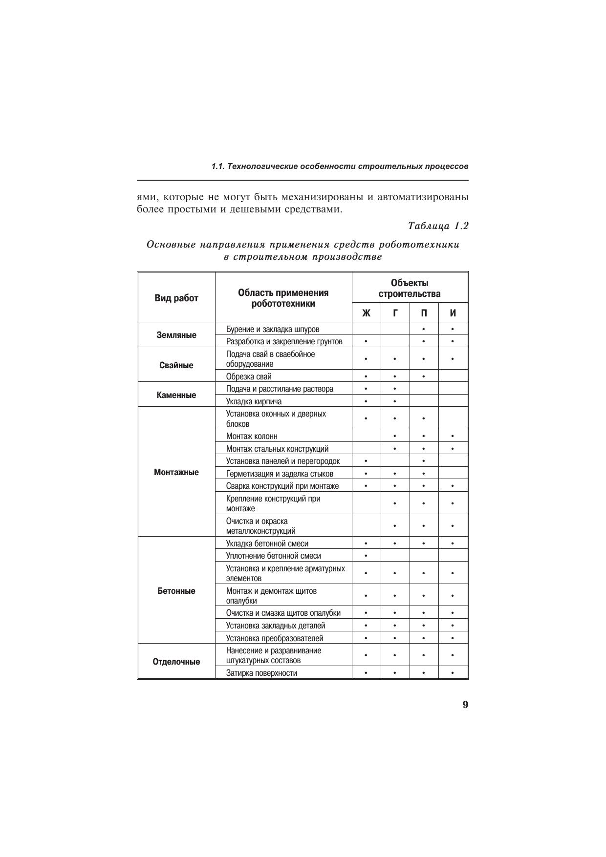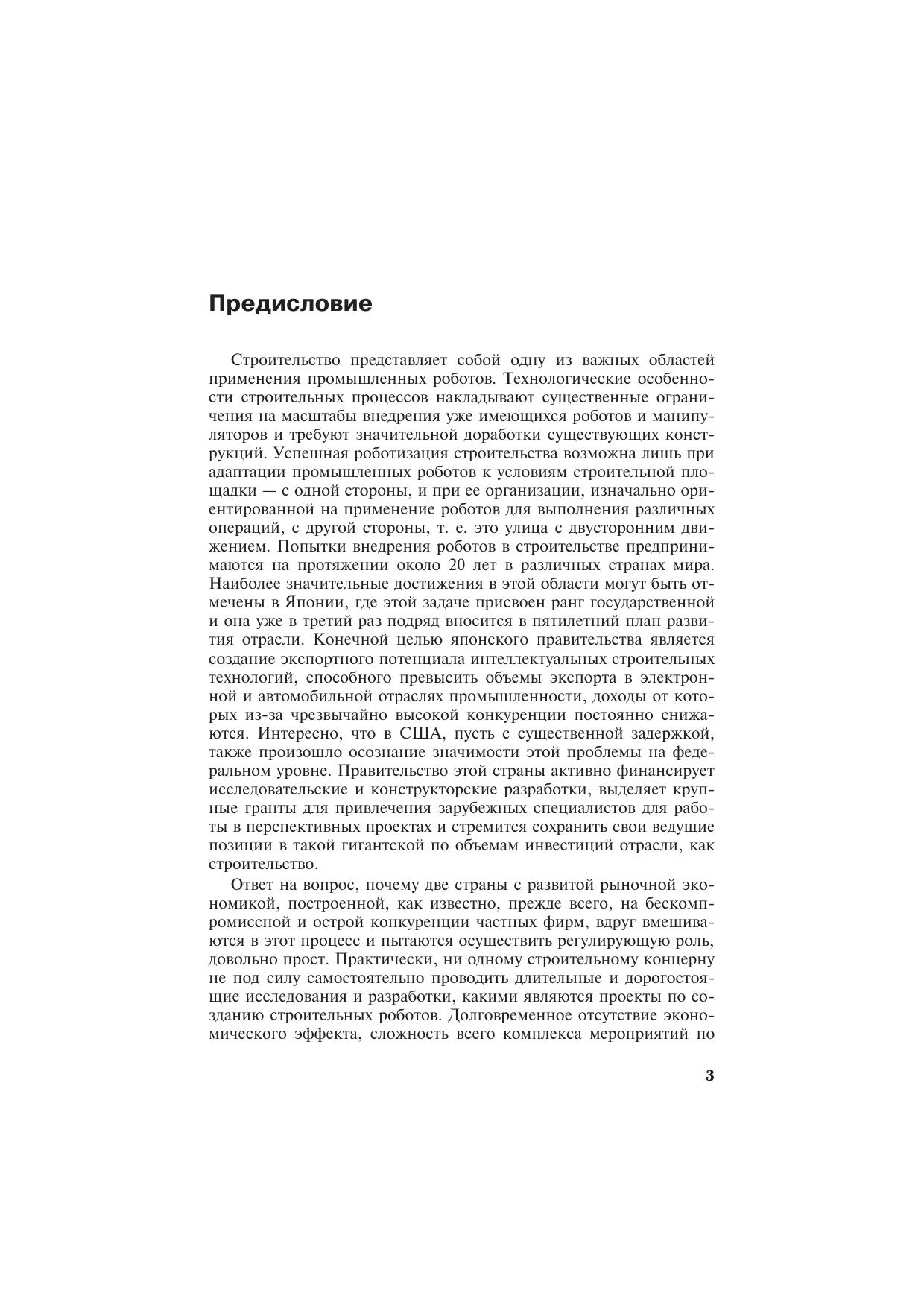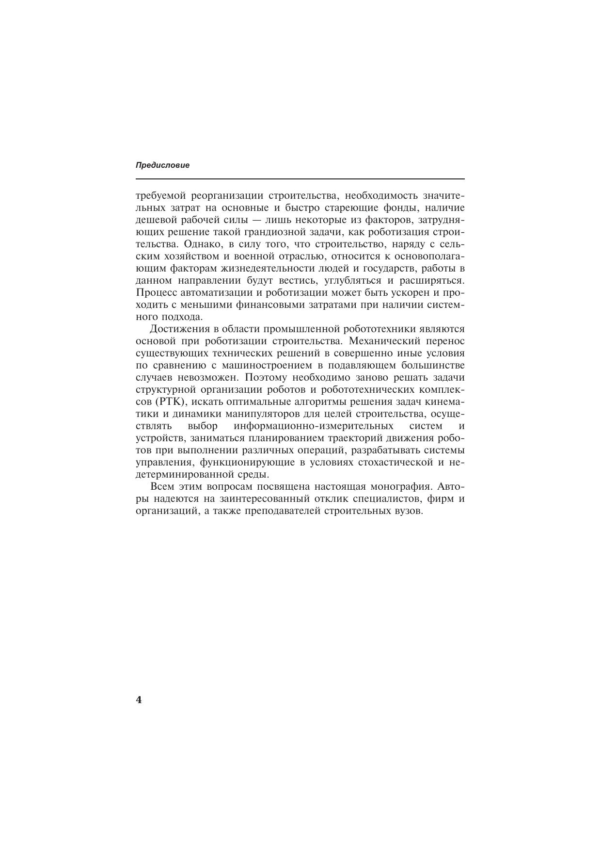 В монографии изложены теоретические основы адаптации промышленных роботов для целей строительства. Рассмотрены технологические особенности строительных процессов и задачи их роботизации, сформулированы требования к роботизации строительных процессов и представлена структурная организация роботов и РТК для автоматизации строительных процессов. Описаны манипуляционные системы строительных роботов, алгоритмы решения задач кинематики и динамики манипуляторов и приводы промышленных роботов строительного назначения. Особое внимание уделено информационно-измерительным системам строительных роботов. Рассмотрены задачи планирования траекторий движений роботов при выполнении строительных операций и особенности управления строительными роботами.Для инженерно-технических работников строительных, проектных и научных организаций, занимающихся вопросами механизации, роботизации и автоматизации в строительстве, а также для студентов и аспирантов вузов
