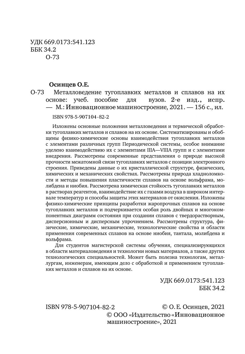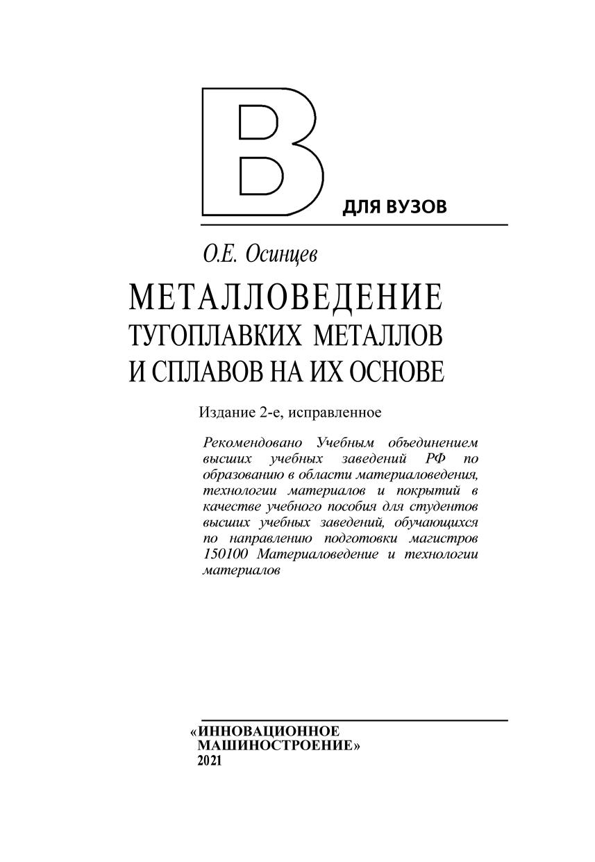 Изложены основные положения металловедения и термической обработки тугоплавких металлов и сплавов на их основе. Систематизированы и обобщены физико-химические основы взаимодействия тугоплавких металлов с элементами различных групп Периодической системы, особое внимание уделено взаимодействию их с элементами IIIAVIIIА групп и с элементами внедрения. Рассмотрены современные представления о природе высокой прочности межатомной связи тугоплавких металлов с позиции электронного строения. Приведены данные о их кристаллической структуре, физических, химических и механических свойствах. Рассмотрены природа хладноломкости и методы повышения пластичности сплавов на основе вольфрама, молибдена и ниобия. Рассмотрена химическая стойкость тугоплавких металлов в растворах реагентов, взаимодействие их с газами воздуха в широком интервале температур и способы защиты этих материалов от окисления. Изложены физико-химические прнципы разработки жаропрочных сплавов на основе тугоплавких металлов и подчеркивается особая роль двойных и многокомпонентных диаграмм состояния при создании сплавов с твердорасплавным, дисперсионным и дисперсным упрочнением. Рассмотрены структура, физические, химические, механические, технологические свойства и области применения современных сплавов на основе ниобия, тантала, молибдена и вольфрама.