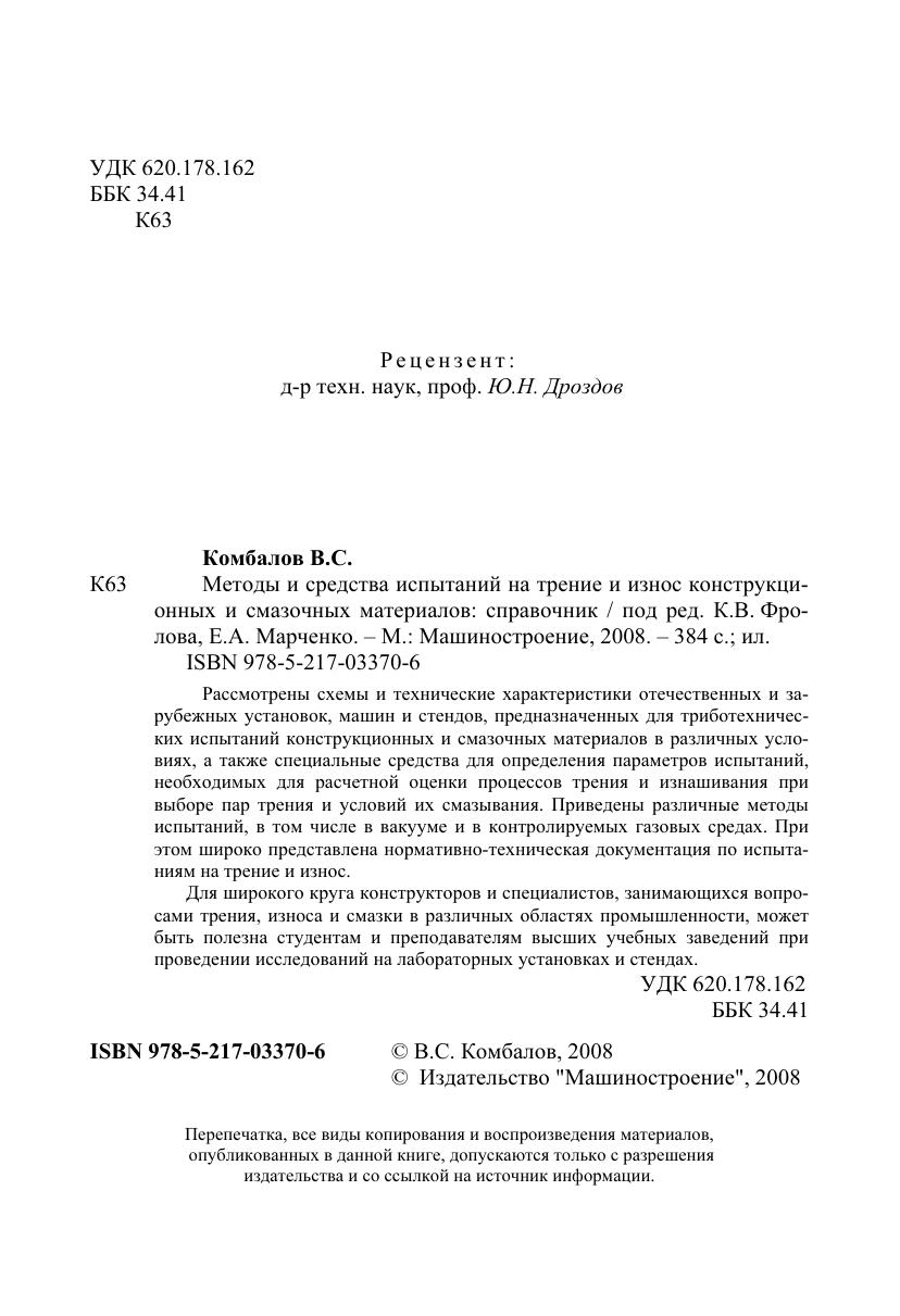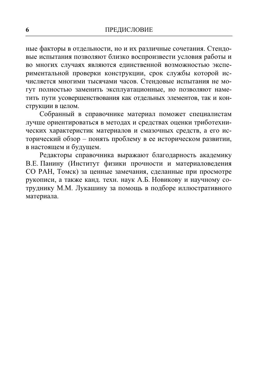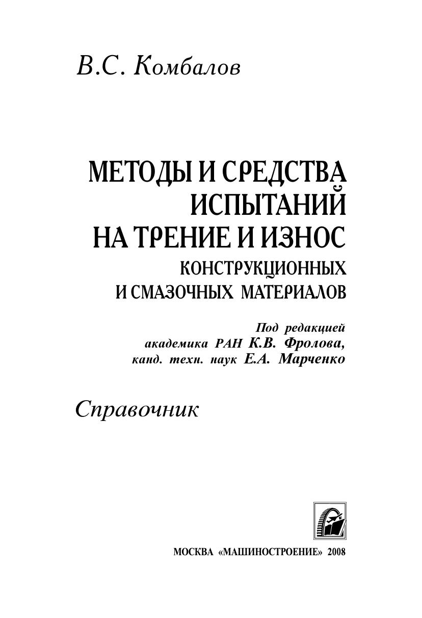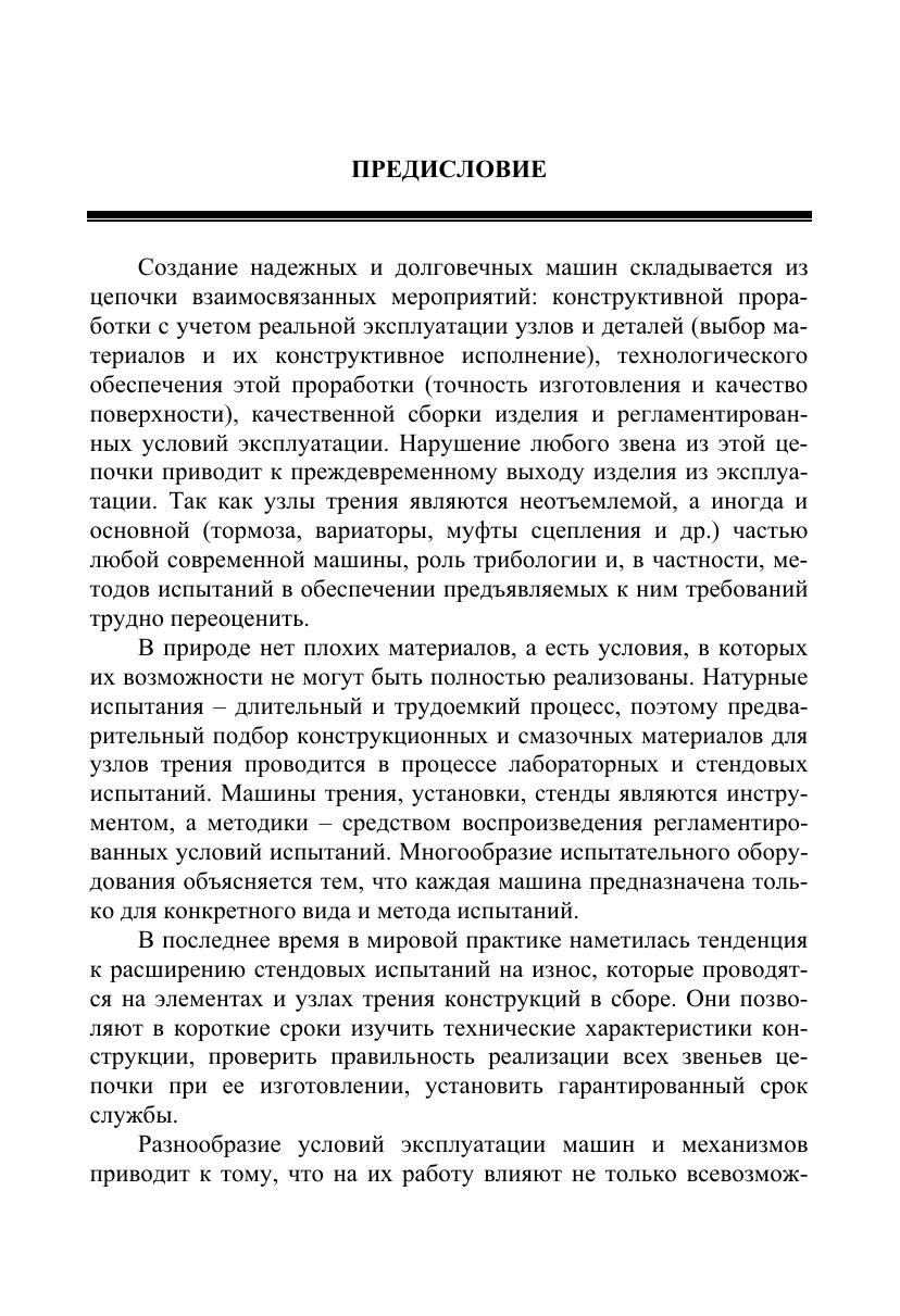 Рассмотрены схемы и технические характеристики отечественных и зарубежных установок, машин и стендов, предназначенных для триботехнических испытаний конструкционных и смазочных материалов в различных условиях, а также специальные средства для определения параметров испытаний, необходимых для расчетной оценки процессов трения и изнашивания при выборе пар трения и условий их смазывания. Приведены различные методы испытаний, в том числе в вакууме и в контролируемых газовых средах. При этом широко представлена нормативно-техническая документация по испытаниям на трение и износ. Для широкого круга конструкторов и специалистов, занимающихся вопросами трения, износа и смазки в различных областях промышленности, может быть полезна студентам и преподавателям высших учебных заведений при проведении исследований на лабораторных установках и стендах.