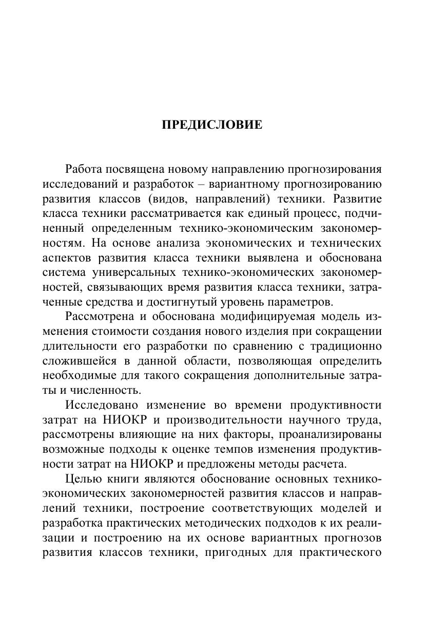 На основе анализа экономических и технических аспектов развития класса техники выявлена и обоснована система универсальных технико-экономических закономерностей, связывающих время развития класса техники, затраченные средства и достигнутый уровень параметров. Разработанная система моделей позволяет с учетом конкуренции классов техники и темпов инфляции затрат на НИОКР решать такие задачи прогнозирования и перспективного планирования вариантного типа, как определение затрат на НИОКР, необходимых для достижения заданного уровня параметров к определенному моменту времени, вариантов уровня параметров класса, достигаемого к определенному моменту в будущем при ограничении суммы затрат и т.п. Изложена методика подготовки информации и построения описанных моделей. Полезна для специалистов, занимающихся планированием и прогнозированием развития исследований и разработок на длительную перспективу, а также для студентов, изучающих вопросы планирования и прогнозирования НИОКР.