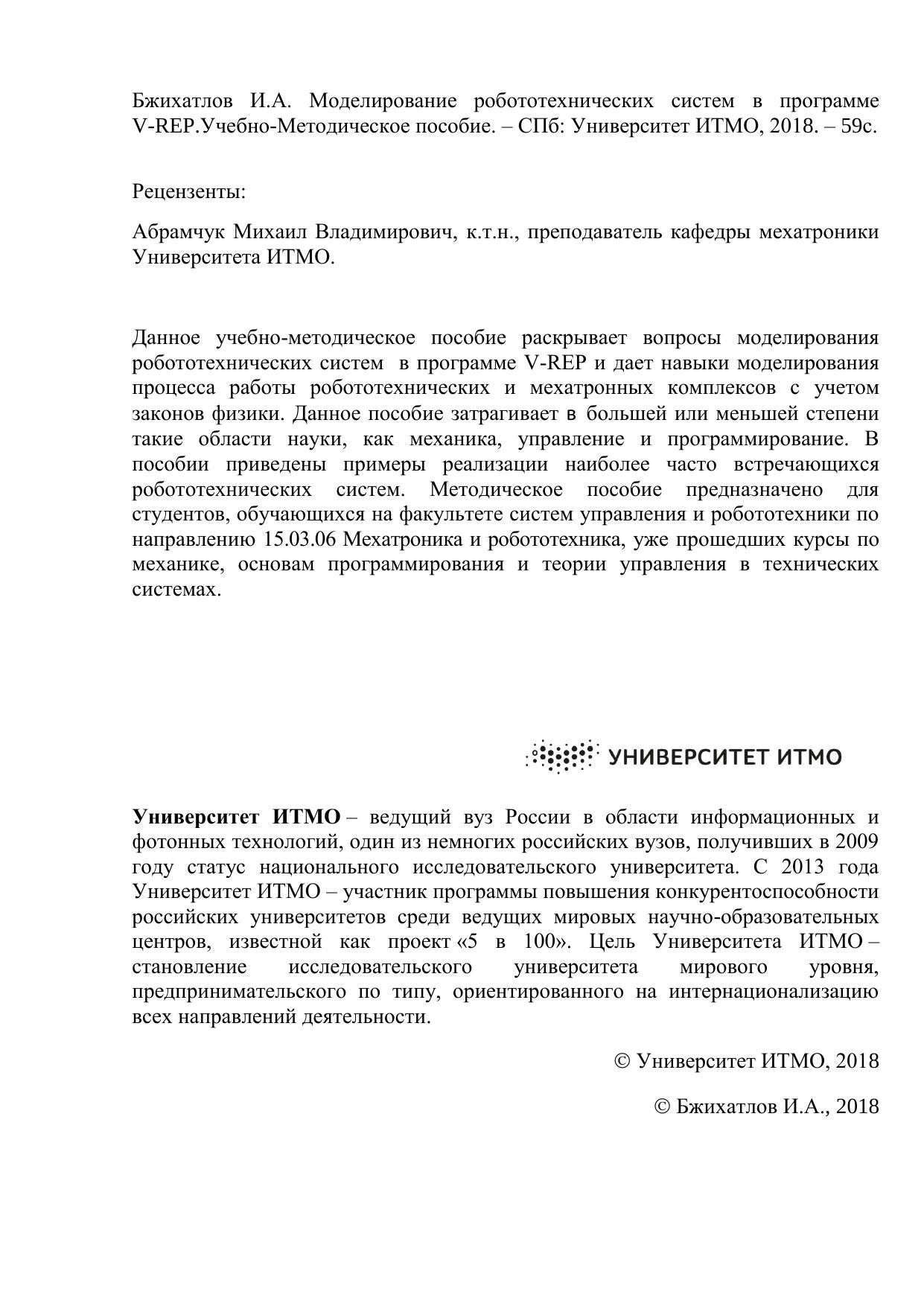 Данное учебно-методическое пособие раскрывает вопросы моделирования робототехнических систем в программе V-REP и дает навыки моделирования процесса работы робототехнических и мехатронных комплексов с учетом законов физики. Данное пособие затрагивает в большей или меньшей степени такие области науки, как механика, управление и программирование. В пособии приведены примеры реализации наиболее часто встречающихся робототехнических систем. Методическое пособие предназначено для студентов, обучающихся на факультете систем управления и робототехники по направлению 15.03.06 Мехатроника и робототехника, уже прошедших курсы по механике, основам программирования и теории управления в технических системах.