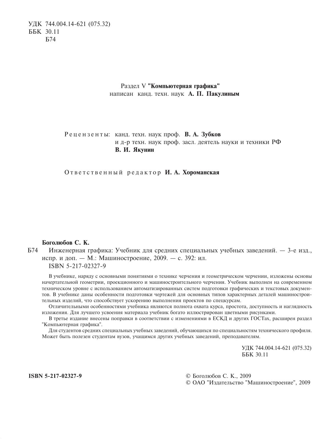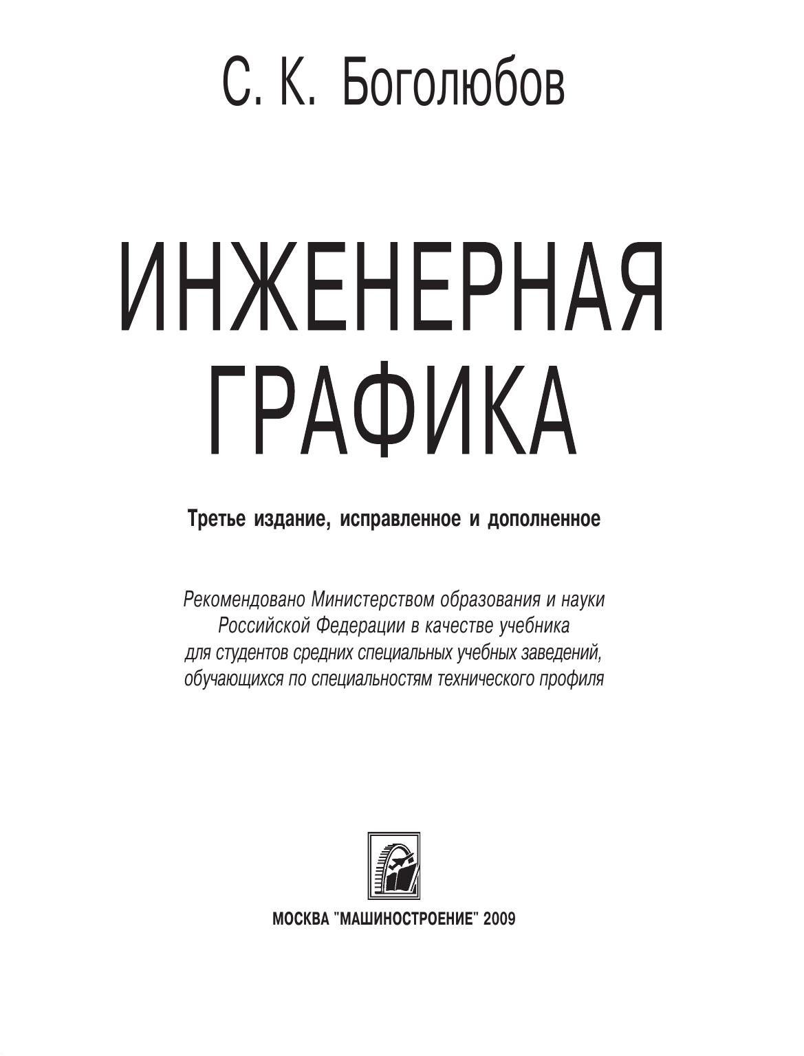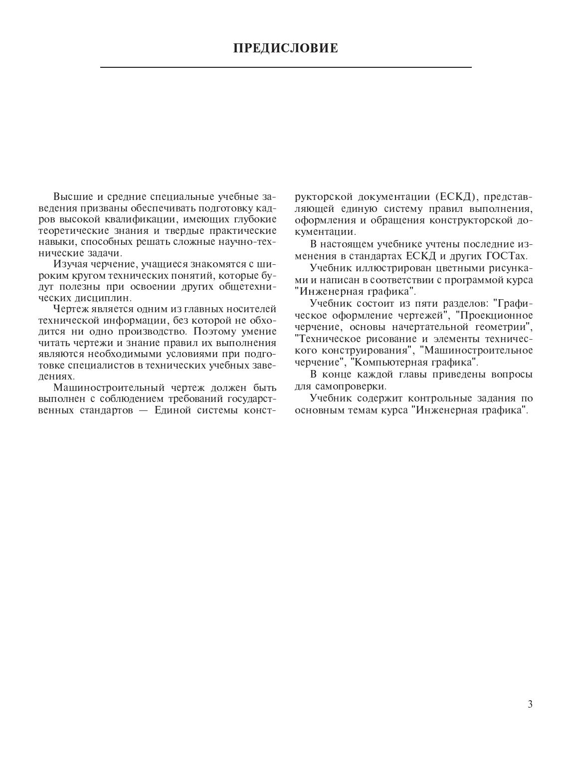 В учебнике, наряду с основными понятиями о технике черчения и геометрическом черчении, изложены основы начертательной геометрии, проекционного и машиностроительного черчения. Учебник выполнен на современном техническом уровне с использованием автоматизированных систем подготовки графических и текстовых документов. В учебнике даны особенности подготовки чертежей для основных типов характерных деталей машиностроительных изделий, что способствует ускорению выполнения проектов по спецкурсам. Отличительными особенностями учебника является полнота охвата курса, простота, доступность и наглядность изложения. Для лучшего усвоения материала учебник богато иллюстрирован цветными рисунками. В третье издание внесены поправки в соответствии с изменениями в ЕСКД и других ГОСТах, расширен раздел «Компьютерная графика». Для студентов средних специальных учебных заведений, обучающихся по специальностям технического профиля. Может быть полезен студентам вузов, учащимся других учебных заведений, преподавателям.