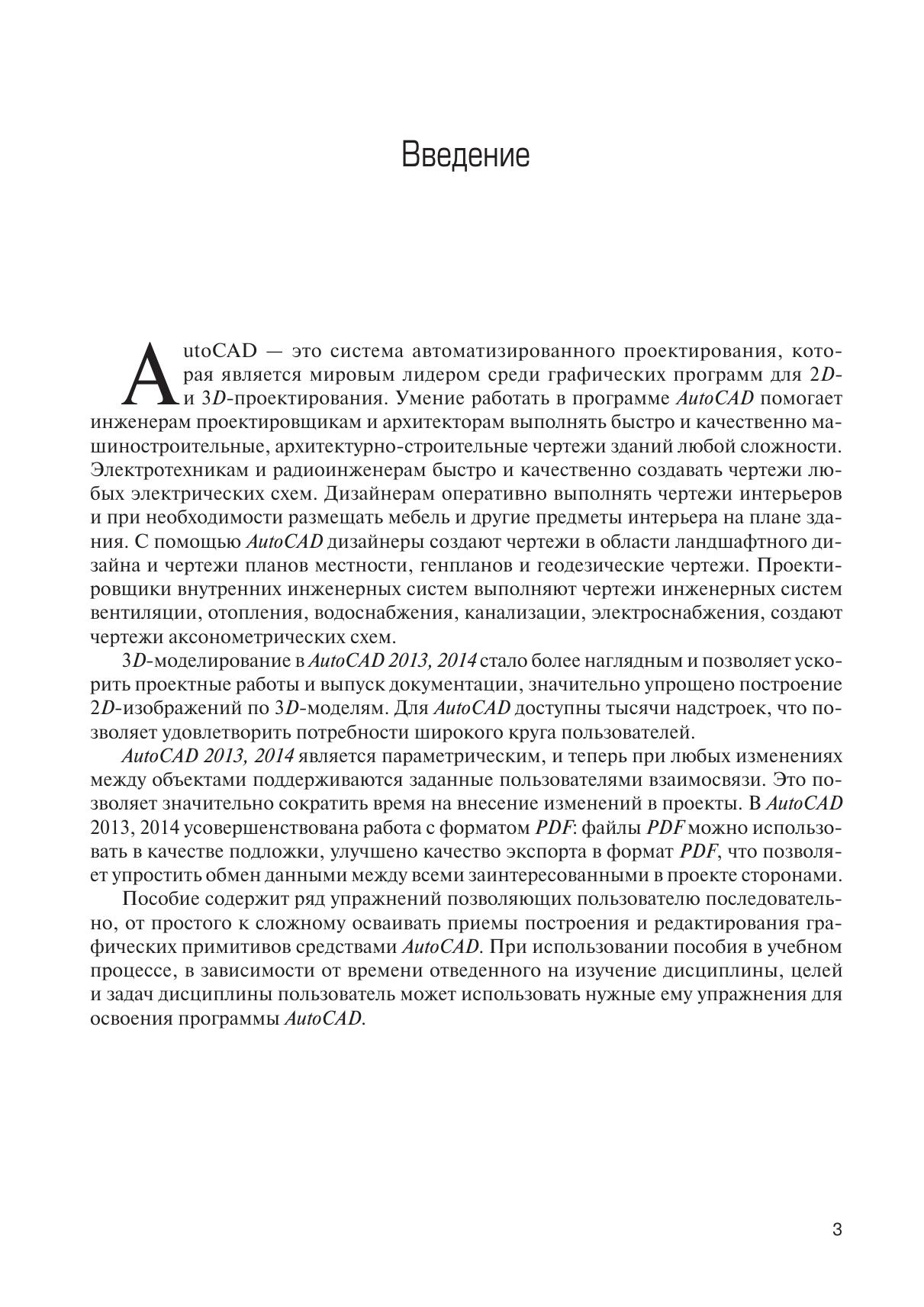 Учебное пособие по дисциплине «Инженерная графика» можно использовать в преподавании дисциплин имеющих раздел «Компьютерная графика», для освоения программы AutoCAD. В пособии изложены способы построения двумерных и трехмерных объектов в AutoCAD 2013, 2014. Пособие включает ряд упражнений, при выполнении которых пользователь постепенно осваивает приемы построения двумерных и трехмерных объектов в AutoCAD 2013, 2014. Представленный ряд упражнений позволяет выбирать упражнения необходимые для конкретного пользователя и индивидуально изучать программу.