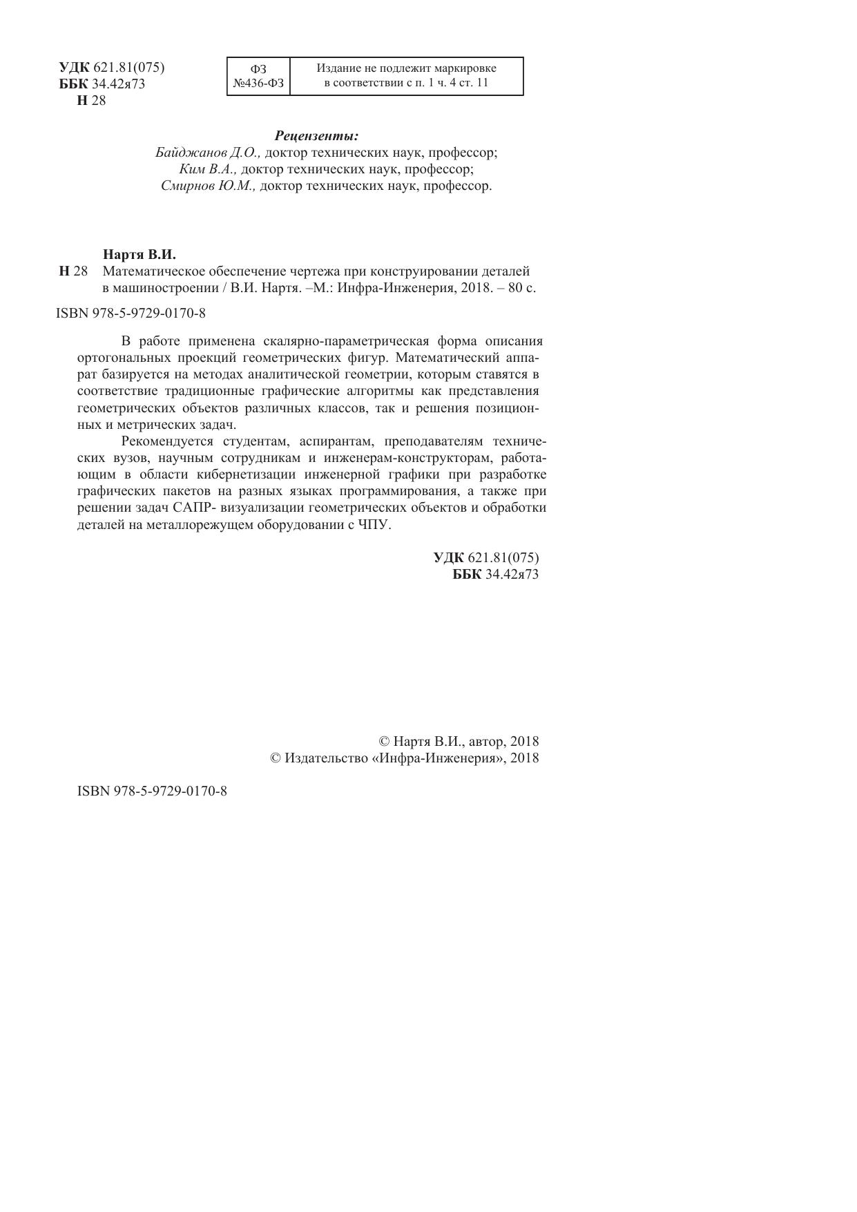 Рекомендуется студентам, аспирантам, преподавателям технических вузов, научным сотрудникам и инженерам-конструкторам, работающим в области кибернетизации инженерной графики при разработке графических пакетов на разных языков программирования, а также при решении задач САПР - визуализации геометрических объектов и обработки деталей на металлорежущем оборудовании с ЧПУ.