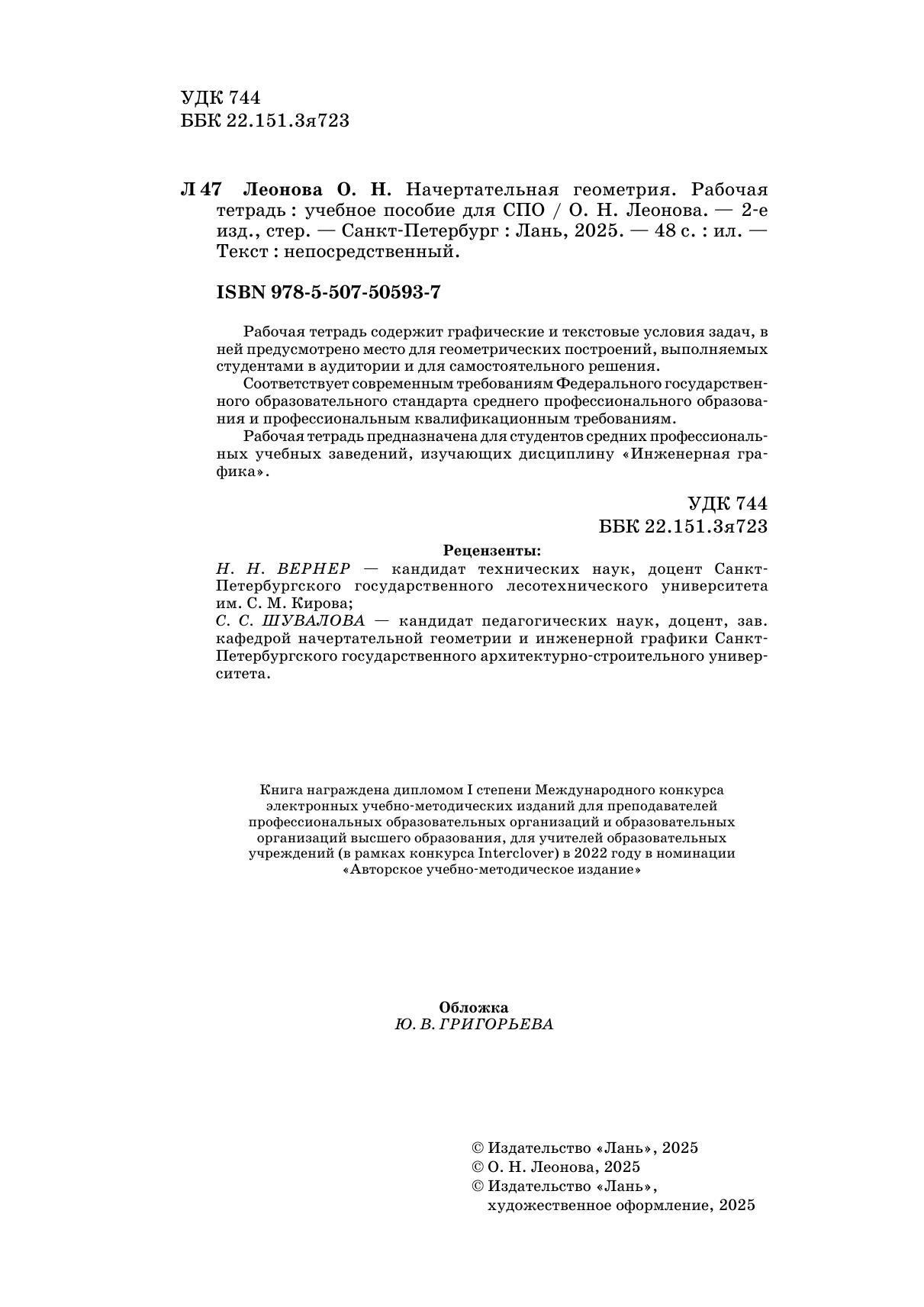 Рабочая тетрадь содержит графические и текстовые условия задач, в ней предусмотрено место для геометрических построений, выполняемых студентами в аудитории и для самостоятельного решения. Соответствует современным требованиям Федерального государственного образовательного стандарта среднего профессионального образования и профессиональным квалификационным требованиям. Рабочая тетрадь предназначена для студентов средних профессиональных учебных заведений, изучающих дисциплину «Инженерная графика».