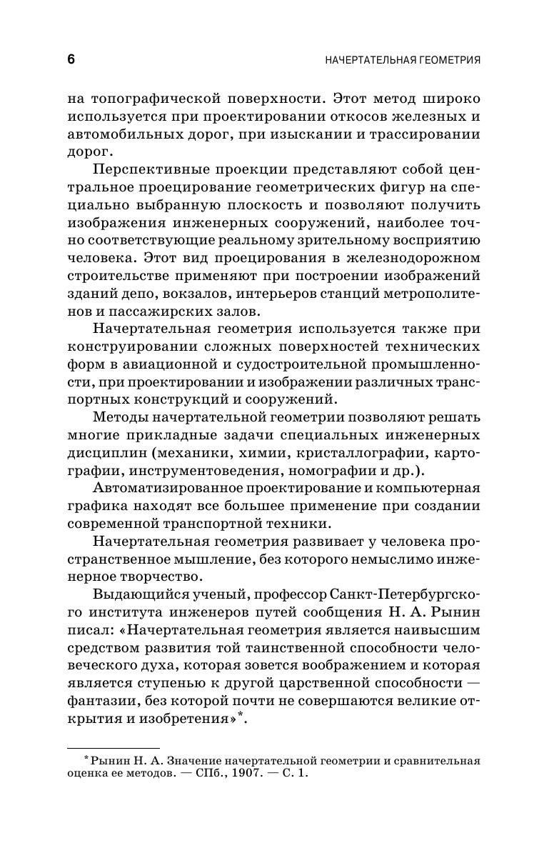 Изложены основы метода проекций, методы изображения пространственных фигур на плоскости, способы преобразования ортогональных проекций, даны графические способы решения метрических и позиционных задач, основные сведения о кривых линиях, многогранниках и кривых поверхностях, рассмотрены теоретические основы аксонометрических проекций и основы построения теней в ортогональных и аксонометрических проекциях. Учебник предназначен для студентов механических, строительных и инженерно-технических направлений подготовки высших учебных заведений.