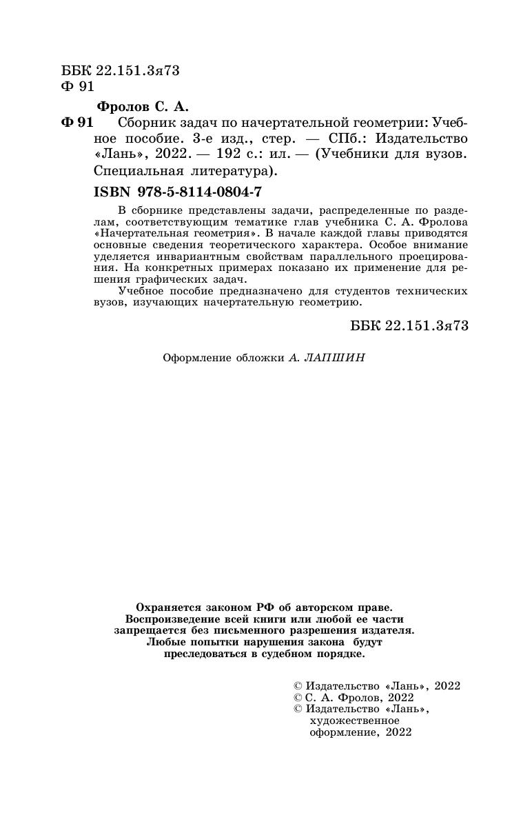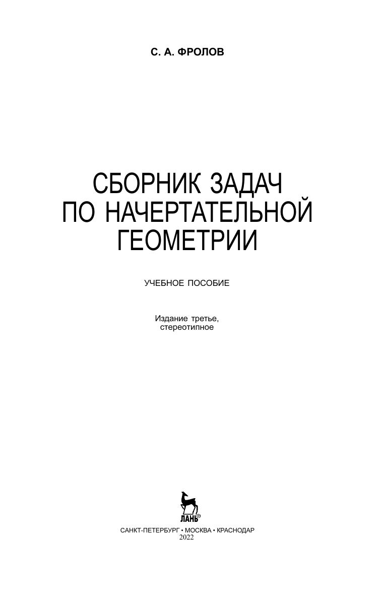 В сборнике представлены задачи, распределенные по разделам, соответствующим тематике глав учебника С. А. Фролова «Начертательная геометрия». В начале каждой главы приводятся основные сведения теоретического характера. Особое внимание уделяется инвариантным свойствам параллельного проецирования. На конкретных примерах показано их применение для решения графических задач. Учебное пособие предназначено для студентов технических вузов, изучающих начертательную геометрию.