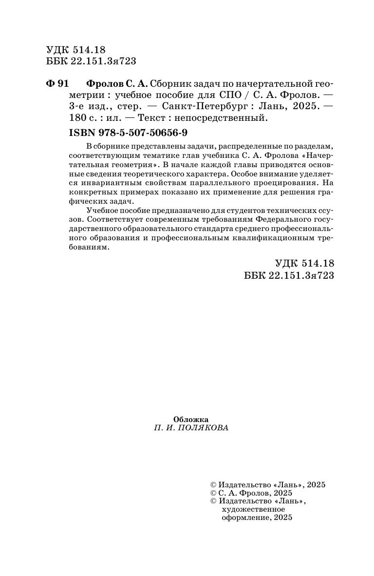 В сборнике представлены задачи, распределенные по разделам, соответствующим тематике глав учебника С. А. Фролова «Начертательная геометрия». В начале каждой главы приводятся основные сведения теоретического характера. Особое внимание уделяется инвариантным свойствам параллельного проецирования. На конкретных примерах показано их применение для решения графических задач. Учебное пособие предназначено для студентов технических ссузов. Соответствует современным требованиям Федерального государственного образовательного стандарта среднего профессионального образования и профессиональным квалификационным требованиям.