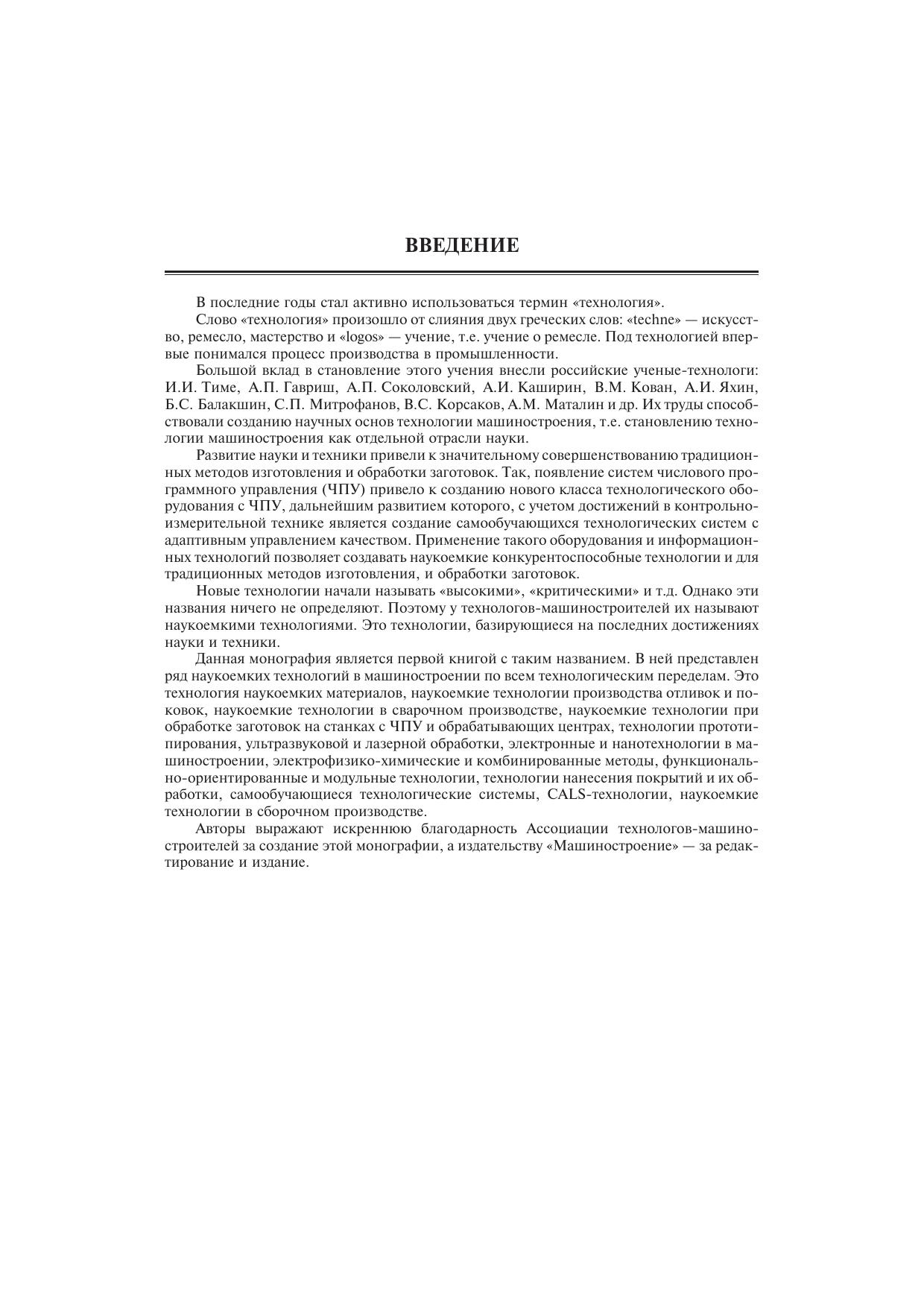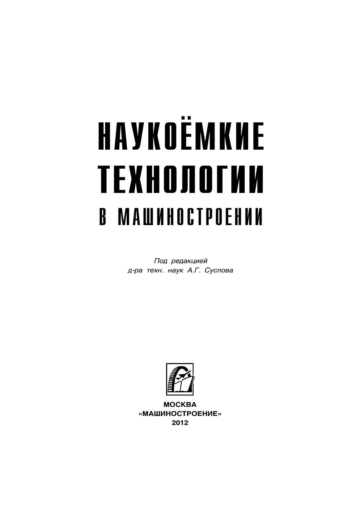 Изложены наукоемкие (высокие) технологии в машиностроении по всем технологическим переделам: производство материалов, отливок получение заготовок обработкой давлением сварочное производство обработка заготовок модификация поверхностных слоев деталей сборочное производство. Особое внимание уделено наукоемким технологиям при обработке заготовок (обработке на станках с ЧПУ и самообучающихся станках с адаптивным управлением) функционально-ориентированным и модульным технологиям, лазерным, электрофизико-химическим и нанотехнологиям. Для инженерно-технических работников промышленных предприятий. Может быть полезна для студентов, магистрантов, аспирантов и преподавателей технических вузов.