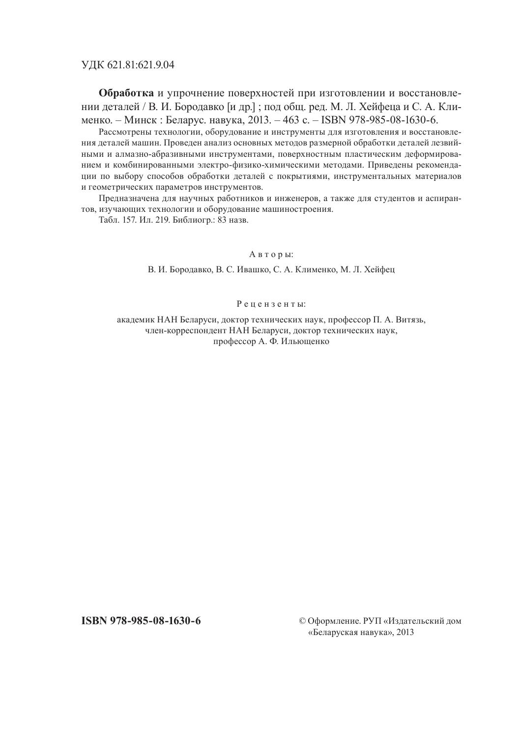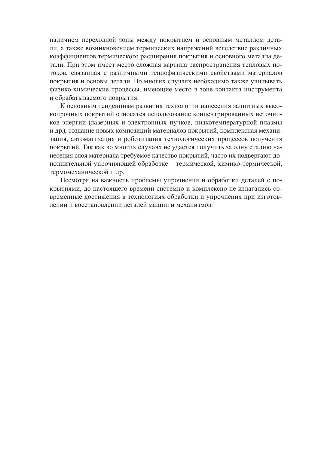 Рассмотрены технологии, оборудование и инструменты для изготовления и восстановления деталей машин. Проведен анализ основных методов размерной обработки деталей лезвийными и алмазно-абразивными инструментами, поверхностным пластическим деформированием и комбинированными электро-физико-химическими методами. Приведены рекомендации по выбору способов обработки деталей с покрытиями, инструментальных материалов и геометрических параметров инструментов. Предназначена для научных работников и инженеров, а также для студентов и аспирантов, изучающих технологии и оборудование машиностроения.