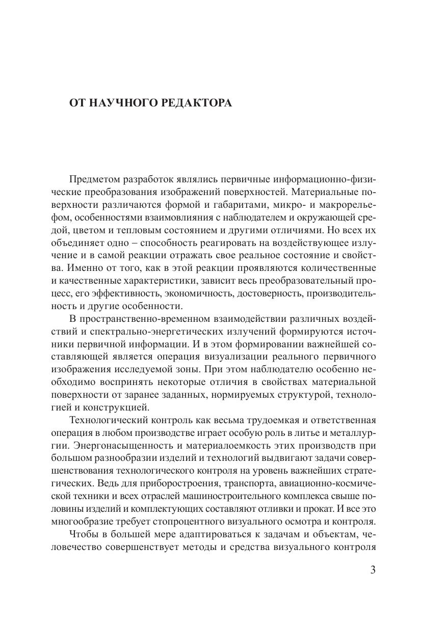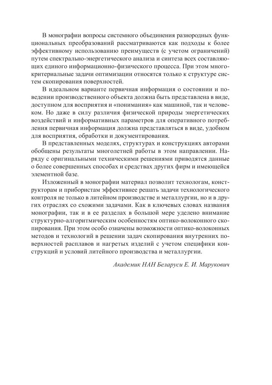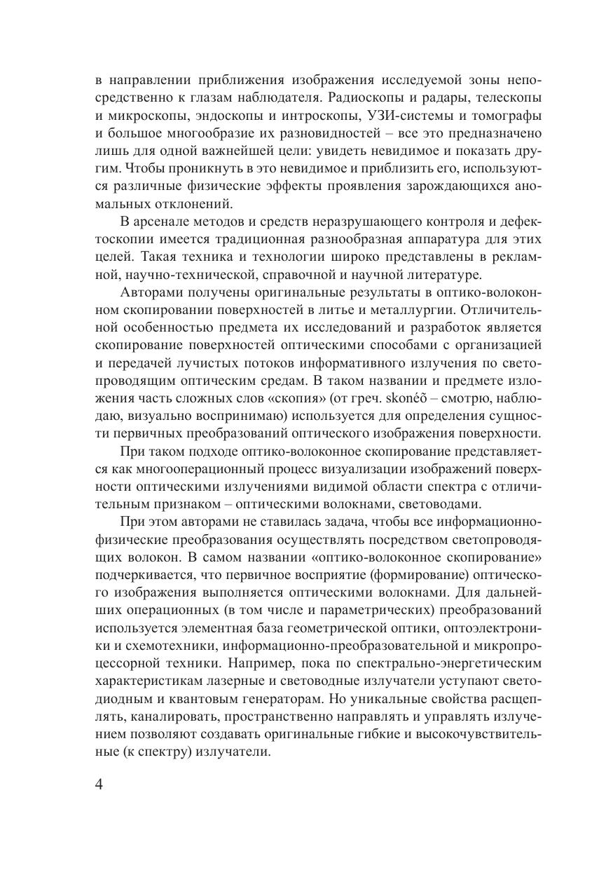В монографии систематизированы способы оптического скопирования внутренних зон, нагретых поверхностей и расплавов, применение которых представляется целесообразным при совершенствовании литейного производства и металлургии. Собрана и обширно представлена элементная база волоконной оптики, электронной, оптоэлектронной и видеотехники, ориентированная на системное решение задач визуализации полей различной физической природы, характерных для литейного производства. Рассмотрены операционные особенности информационно-преобразовательного процесса технологического контроля, структура оптико-волоконного скопирования, модели, способы и технологии оптической термоскопии с учетом специфики информационно-физических преобразований и дистанцирования оптической информации. Особое внимание уделено спектрально-энергетическим преобразованиям первичной информации оптическими светопроводящими волокнами и структурам систем переноса и формирования оптических изображений на их основе. Предназначена для инженеров, технологов и исследователей, занимающихся технологиями и разработкой новых конструкций и изделий. Может быть полезна работникам лабораторий и отделов технического контроля, служб качества и диагностики, а также студентам, магистрантам и аспирантам инженерных и технологических специальностей.