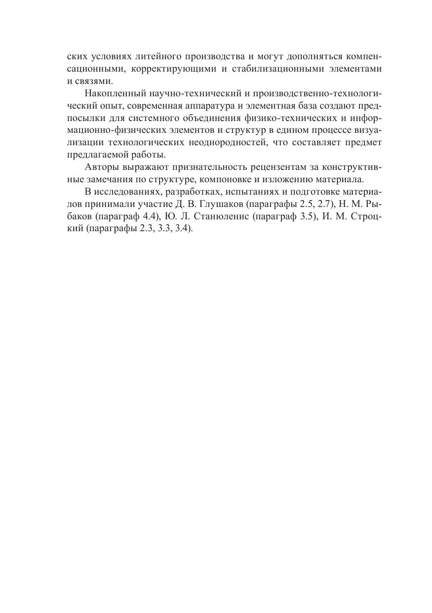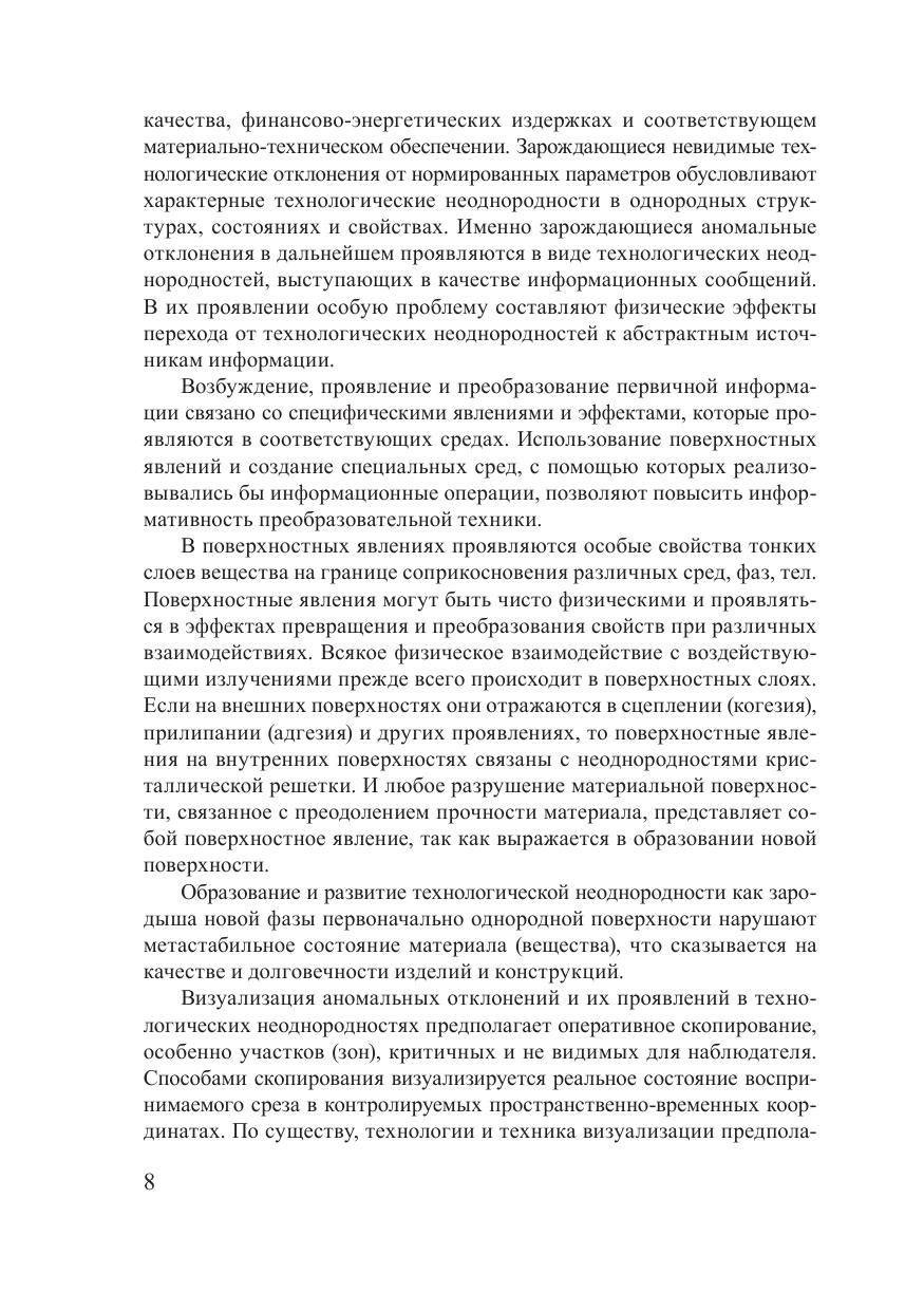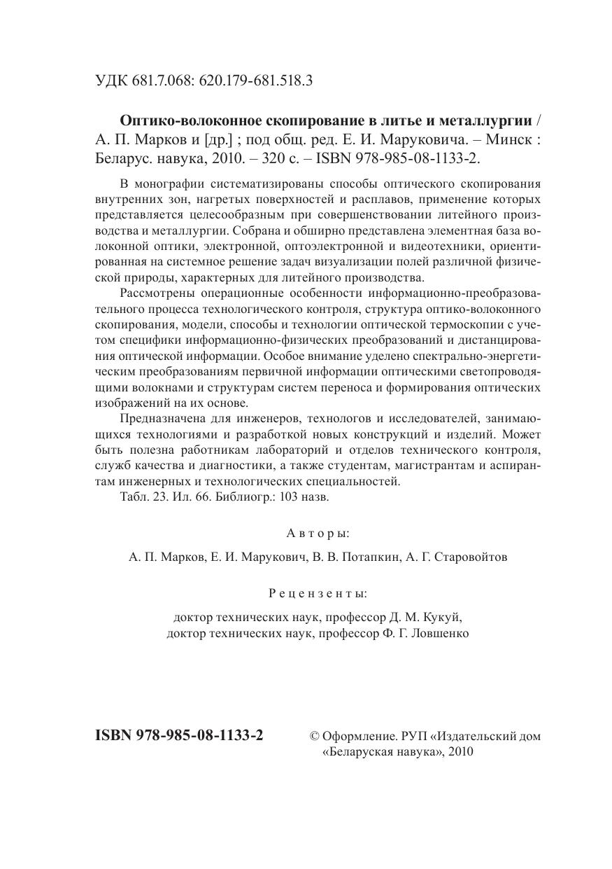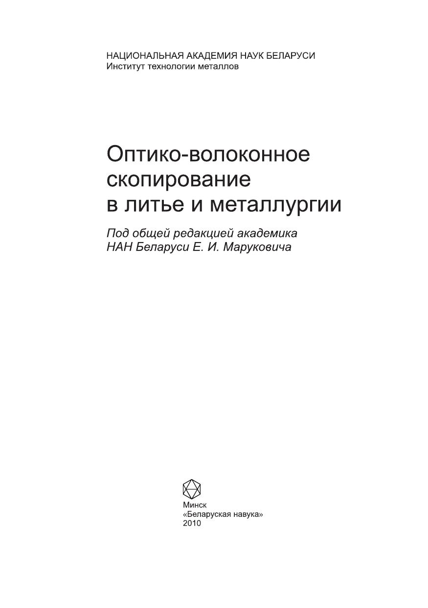 В монографии систематизированы способы оптического скопирования внутренних зон, нагретых поверхностей и расплавов, применение которых представляется целесообразным при совершенствовании литейного производства и металлургии. Собрана и обширно представлена элементная база волоконной оптики, электронной, оптоэлектронной и видеотехники, ориентированная на системное решение задач визуализации полей различной физической природы, характерных для литейного производства. Рассмотрены операционные особенности информационно-преобразовательного процесса технологического контроля, структура оптико-волоконного скопирования, модели, способы и технологии оптической термоскопии с учетом специфики информационно-физических преобразований и дистанцирования оптической информации. Особое внимание уделено спектрально-энергетическим преобразованиям первичной информации оптическими светопроводящими волокнами и структурам систем переноса и формирования оптических изображений на их основе. Предназначена для инженеров, технологов и исследователей, занимающихся технологиями и разработкой новых конструкций и изделий. Может быть полезна работникам лабораторий и отделов технического контроля, служб качества и диагностики, а также студентам, магистрантам и аспирантам инженерных и технологических специальностей.