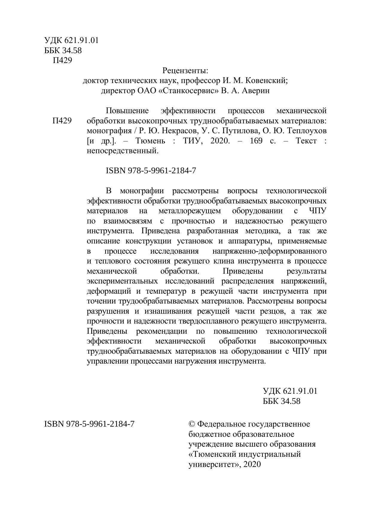 В монографии рассмотрены вопросы технологической эффективности обработки труднообрабатываемых высокопрочных материалов на металлорежущем оборудовании с ЧПУ по взаимосвязям с прочностью и надежностью режущего инструмента. Приведена разработанная методика, а так же описание конструкции установок и аппаратуры, применяемые в процессе исследования напряженно-деформированного и теплового состояния режущего клина инструмента в процессе механической обработки. Приведены результаты экспериментальных исследований распределения напряжений, деформаций и температур в режущей части инструмента при точении трудообрабатываемых материалов. Рассмотрены вопросы разрушения и изнашивания режущей части резцов, а так же прочности и надежности твердосплавного режущего инструмента. Приведены рекомендации по повышению технологической эффективности механической обработки высокопрочных труднообрабатываемых материалов на оборудовании с ЧПУ при управлении процессами нагружения инструмента.