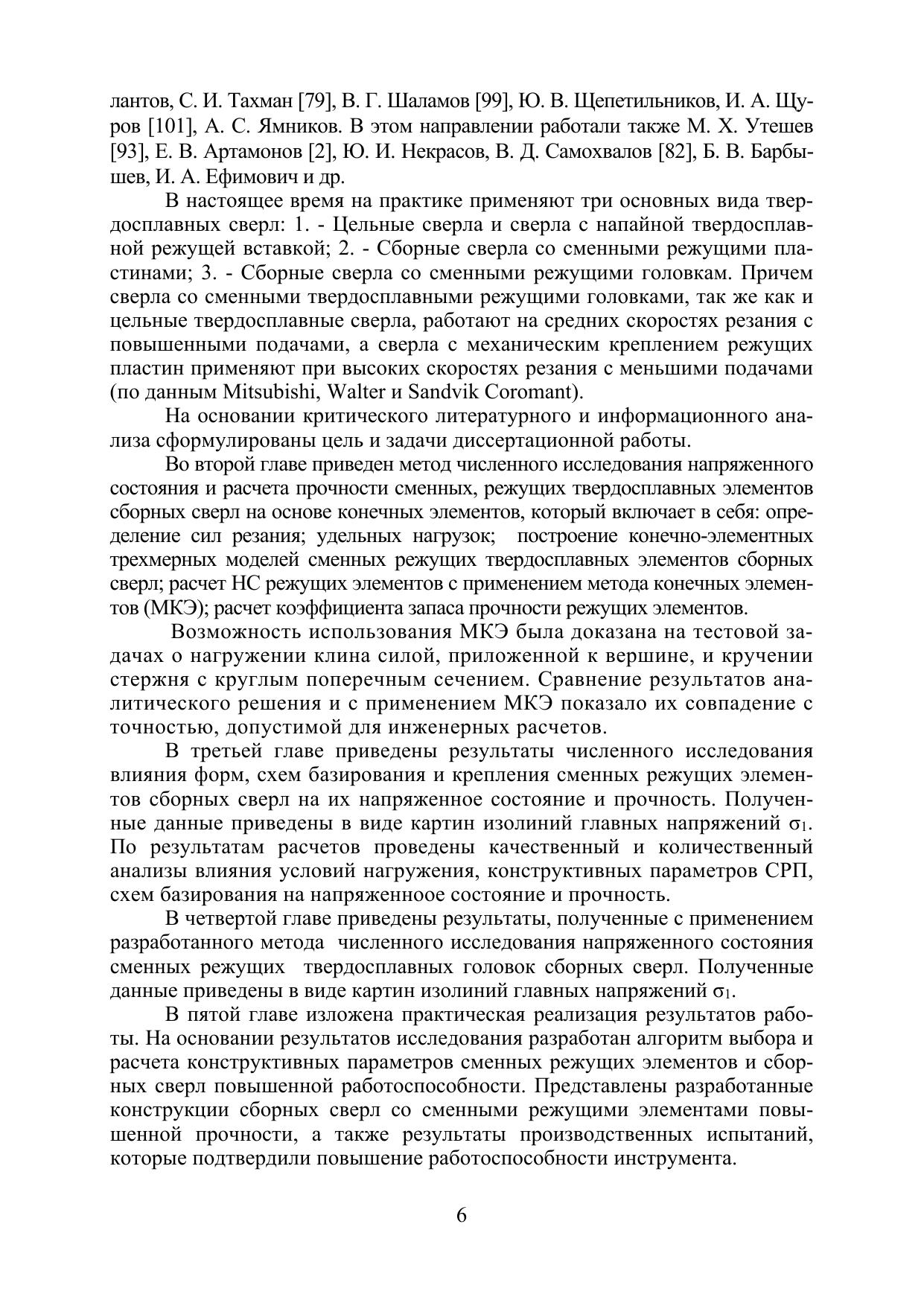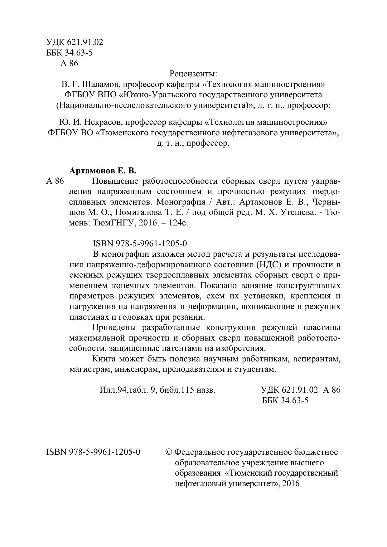 В монографии изложен метод расчета и результаты исследования напряженно-деформированного состояния (НДС) и прочности в сменных режущих твердосплавных элементах сборных сверл с применением конечных элементов. Показано влияние конструктивных параметров режущих элементов, схем их установки, крепления и нагружения на напряжения и деформации, возникающие в режущих пластинах и головках при резании. Приведены разработанные конструкции режущей пластины максимальной прочности и сборных сверл повышенной работоспособности, защищенные патентами на изобретения.