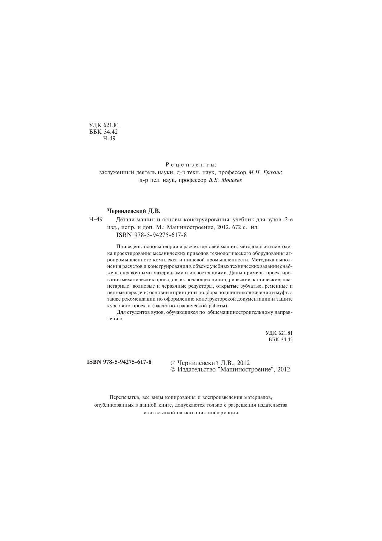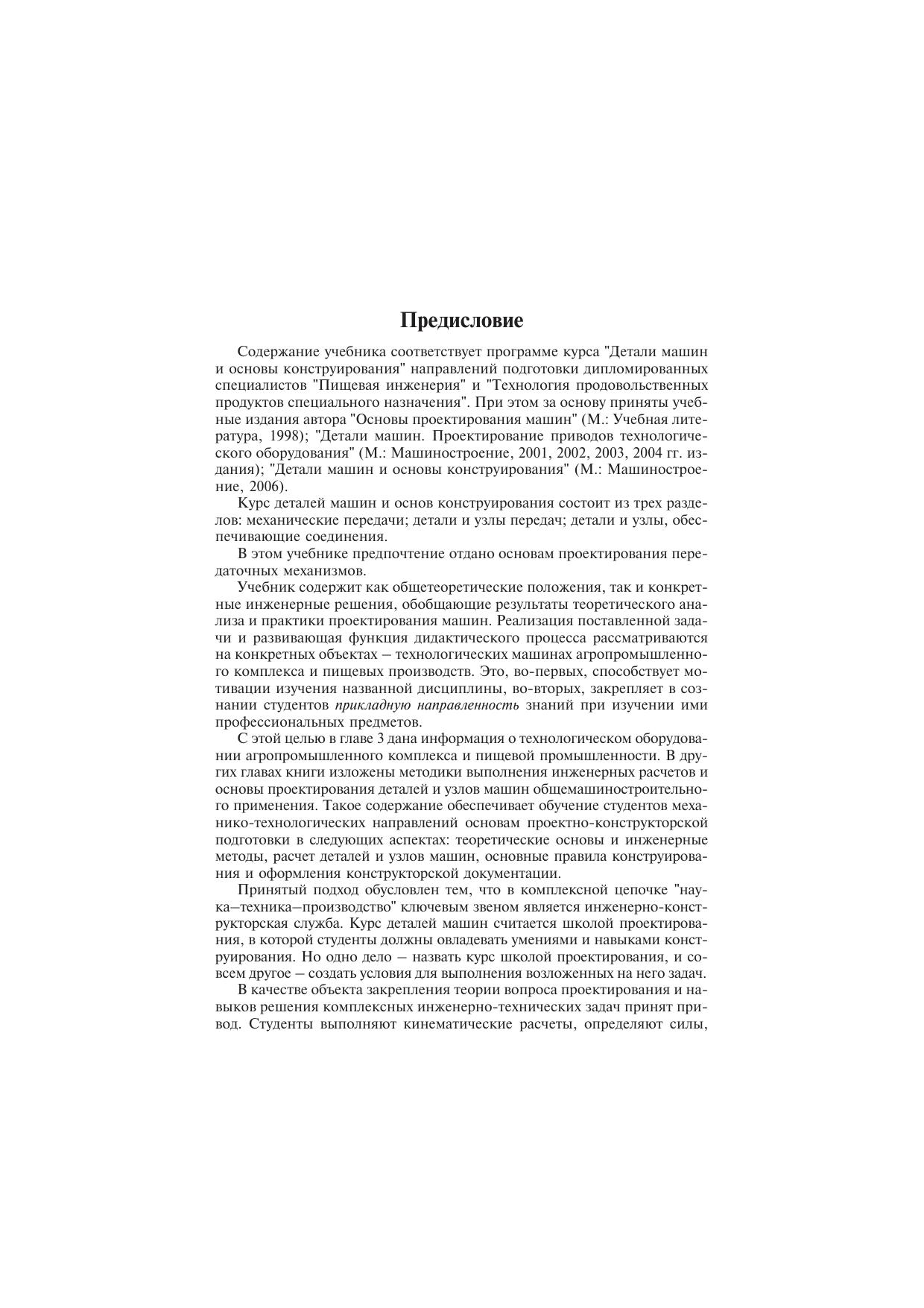 Приведены основы теории и расчета деталей машин, методология и методика проектирования механических приводов технологического оборудования агропромышленного комплекса и пищевой промышленности. Методика выполнения расчетов и конструирования в объеме учебных технических заданий снабжена справочными материалами и иллюстрациями. Даны примеры проектирования механических приводов, включающих цилиндрические, конические, планетарные, волновые и червячные редукторы, открытые зубчатые, ременные и цепные передачи. Основные принципы подбора подшипников качения и муфт, а также рекомендации по оформлению конструкторской документации и защите курсового проекта (расчетно-графической работы). Для студентов вузов, обучающихся по общемашиностроительному направлению.
