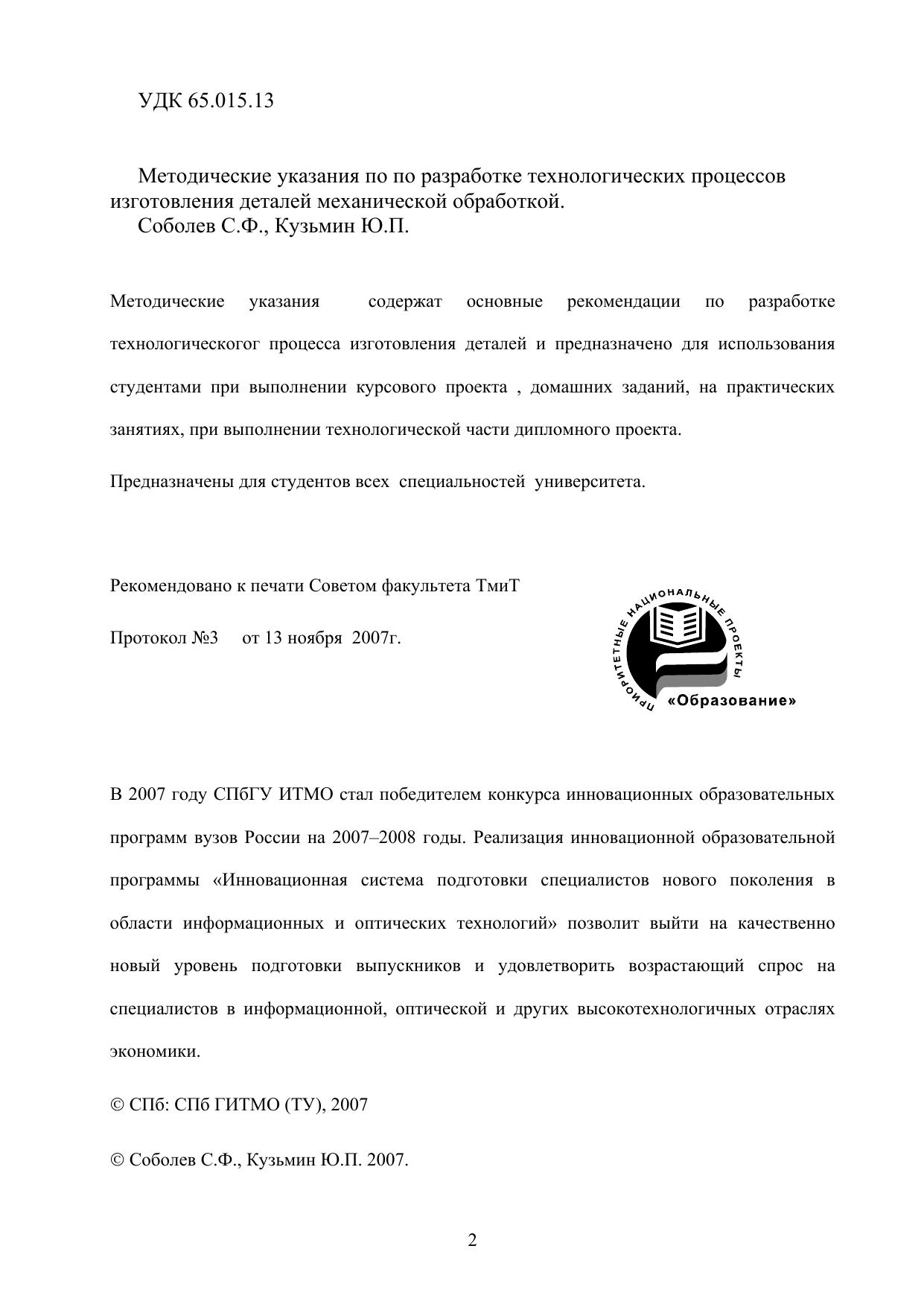 Методические указания содержат основные рекомендации по разработке технологическогог процесса изготовления деталей и предназначено для использования студентами при выполнении курсового проекта, домашних заданий, на практических занятиях, при выполнении технологической части дипломного проекта. Предназначены для студентов всех специальностей университета.