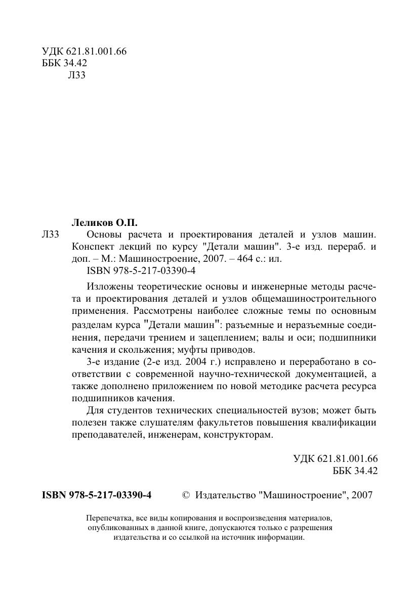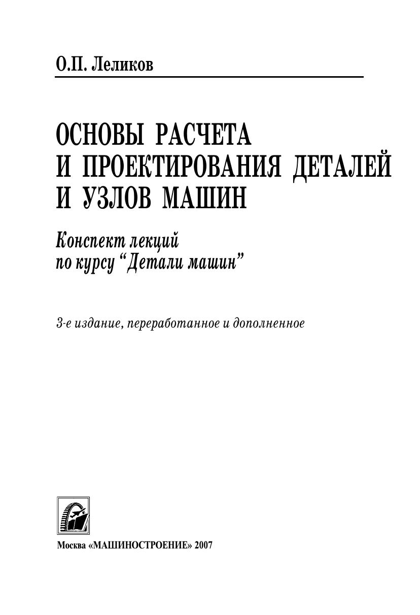 Изложены теоретические основы и инженерные методы расчета и проектирования деталей и узлов общемашиностроительного применения. Рассмотрены наиболее сложные темы по основным разделам курса "Детали машин": разъемные и неразъемные соединения, передачи трением и зацеплением валы и оси подшипники качения и скольжения муфты приводов. 3-е издание (2-е изд. 2004 г.) исправлено и переработано в соответствии с современной научно-технической документацией, а также дополнено приложением по новой методике расчета ресурса подшипников качения. Для студентов технических специальностей вузов может быть полезен также слушателям факультетов повышения квалификации преподавателей, инженерам, конструкторам.