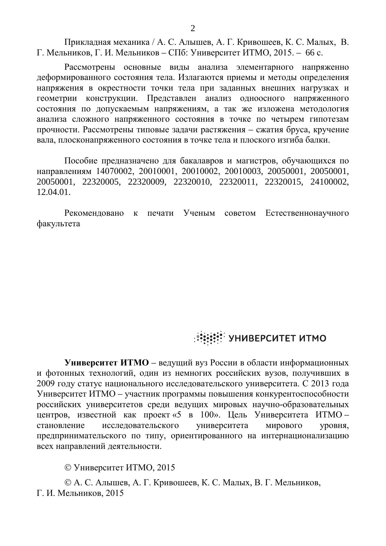 Рассмотрены основные виды анализа элементарного напряженно деформированного состояния тела. Излагаются приемы и методы определения напряжения в окрестности точки тела при заданных внешних нагрузках и геометрии конструкции. Представлен анализ одноосного напряженного состояния по допускаемым напряжениям, а так же изложена методология анализа сложного напряженного состояния в точке по четырем гипотезам прочности. Рассмотрены типовые задачи растяжения – сжатия бруса, кручение вала, плосконапряженного состояния в точке тела и плоского изгиба балки. Пособие предназначено для бакалавров и магистров, обучающихся по направлениям 14070002, 20010001, 20010002, 20010003, 20050001, 20050001, 20050001, 22320005, 22320009, 22320010, 22320011, 22320015, 24100002, 12.04.01.