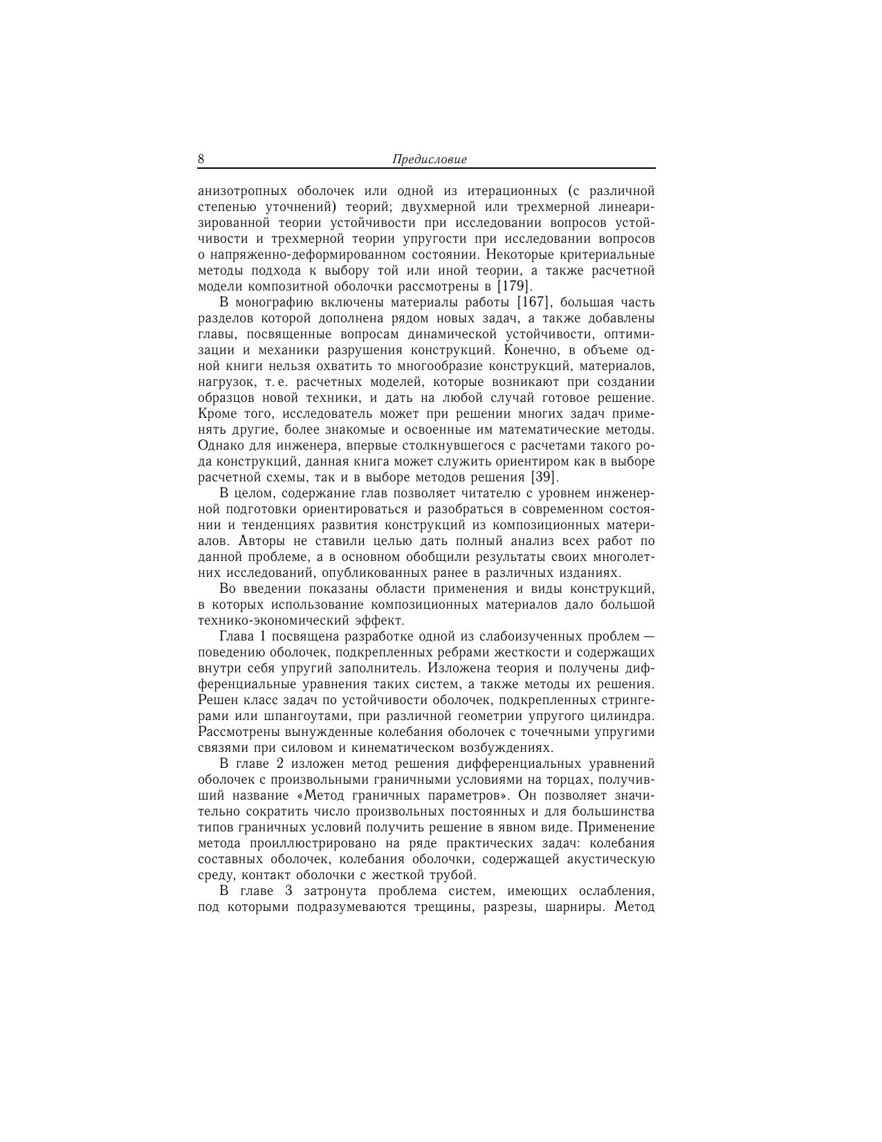 В книге изложены проблемы практического использования композиционных материалов в тонкостенных конструкциях типа цилиндрических оболочек. Получены дифференциальные уравнения устойчивости и колебаний однослойных, трехслойных и слоистых оболочек, подкрепленных ребрами жесткости и упругим цилиндром, и предложены методы их решения. С помощью метода граничных параметров показано влияние граничных условий на состояние оболочек, а также исследовано поведение систем, имеющих естественные или искусственные ослабления. Рассмотрены вопросы динамики оболочек и защитных экранов при действии импульсного излучения и ударов твердых частиц. Решен ряд задач по флаттеру, динамической устойчивости и оптимизации подкрепленных оболочек. Даны методики экспериментов по моделированию процессов, импульсному нагружению и контролю развития трещин. Для специалистов по теории оболочек и строительной механике тонкостенных конструкций авиационной и космической техники, а также конструкторов, научных работников и студентов вузов соответствующих специальностей.