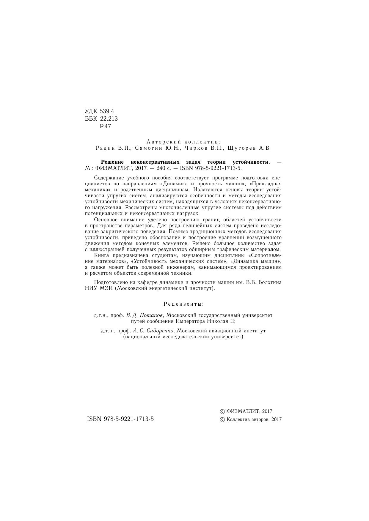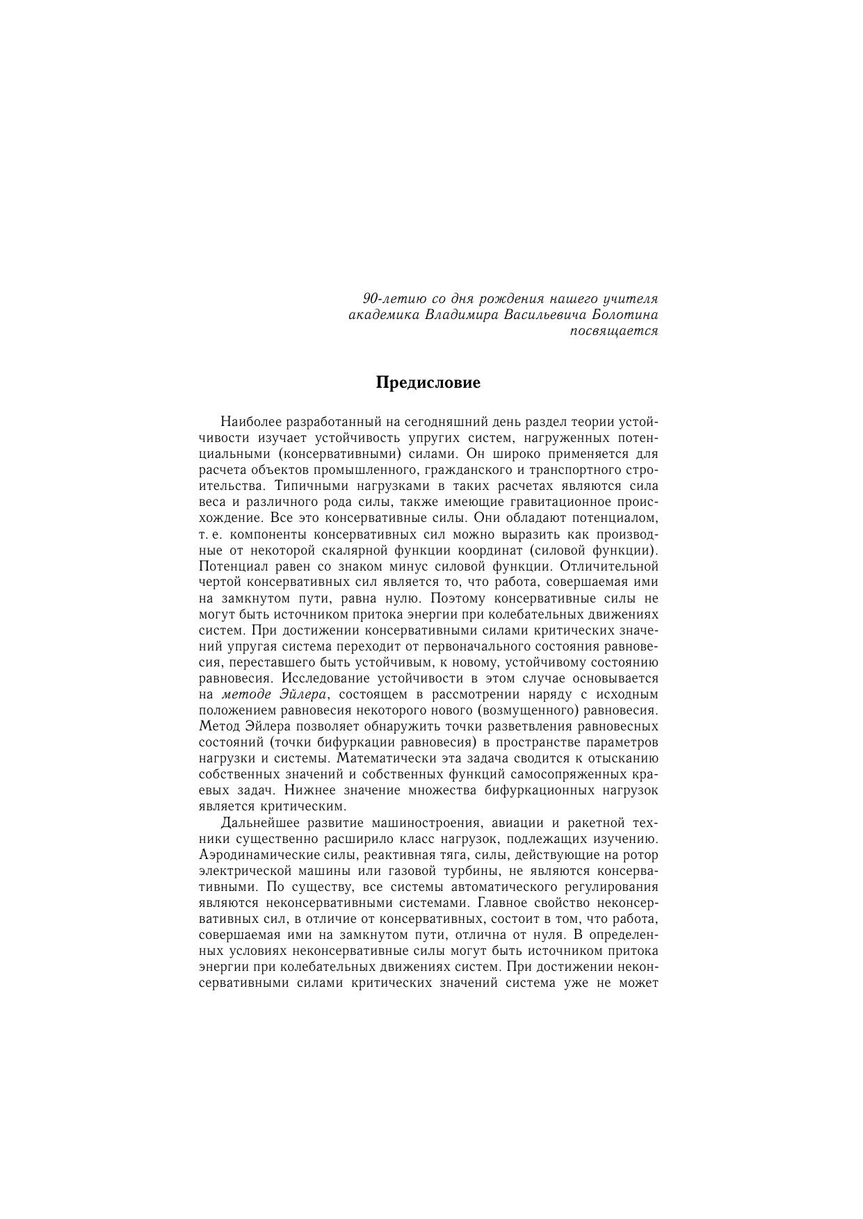 Содержание учебного пособия соответствует программе подготовки специалистов по направлениям «Динамика и прочность машин», «Прикладная механика» и родственным дисциплинам. Излагаются основы теории устойчивости упругих систем, анализируются особенности и методы исследования устойчивости механических систем, находящихся в условиях неконсервативного нагружения. Рассмотрены многочисленные упругие системы под действием потенциальных и неконсервативных нагрузок. Основное внимание уделено построению границ областей устойчивости в пространстве параметров. Для ряда нелинейных систем проведено исследование закритического поведения. Помимо традиционных методов исследования устойчивости, приведено обоснование и построение уравнений возмущенного движения методом конечных элементов. Решено большое количество задач с иллюстрацией полученных результатов обширным графическим материалом. Книга предназначена студентам, изучающим дисциплины «Сопротивление материалов», «Устойчивость механических систем», «Динамика машин»,