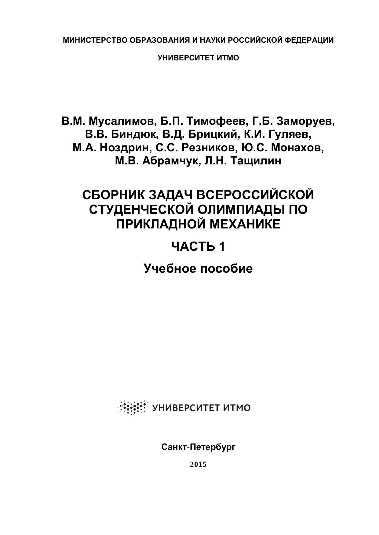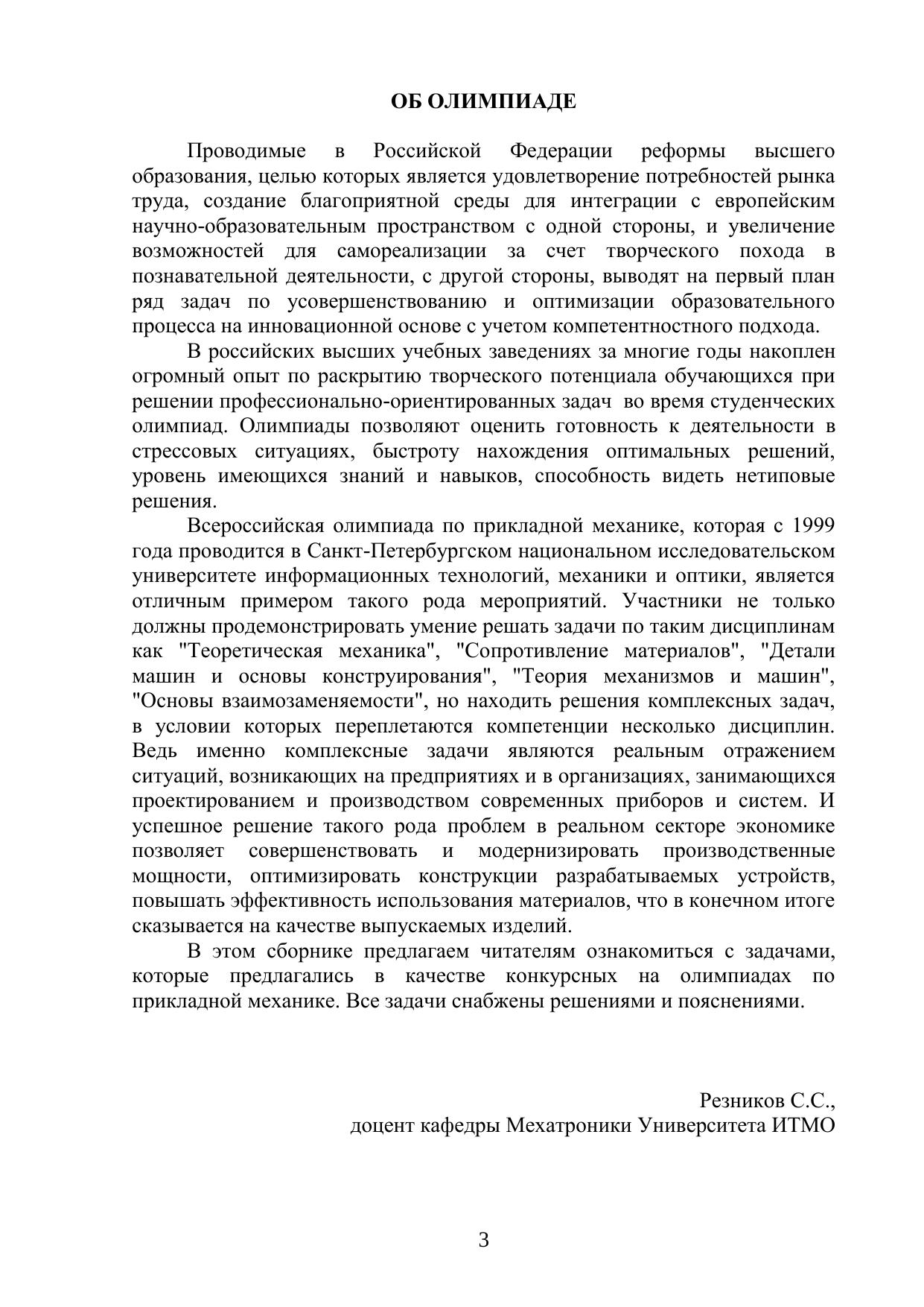 Учебное пособие содержит условия и решения задач Всероссийской студенческой олимпиады по прикладной механике, ежегодно проводимой в Университете ИТМО. В издание вошли задачи 2000-2004 годов. Пособие предназначено для студентов, обучающихся по направлениям подготовки 15.03.06 (221000) «Мехатроника и робототехника», 12.03.01 (200100) «Приборостроение», 12.03.02 «Оптотехника», 13.03.02 «Электроэнергетика и электротехника» при изучении курсов Б.3.2.5 «Прикладная механика», Б.3.1.3 «Прикладная механика», Б.3.2.2 «Теория механизмов и машин», Б.3.2.10 «Основы конструирования механизмов и машин».