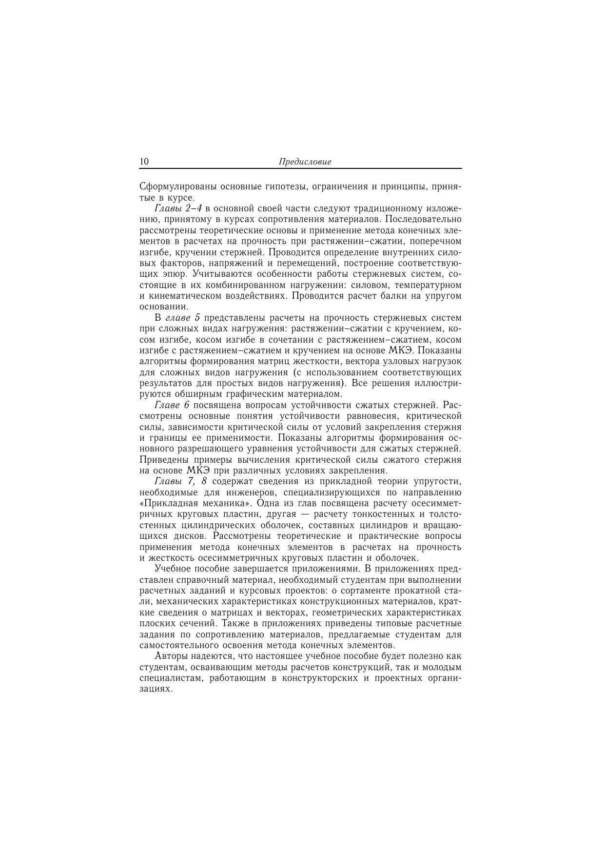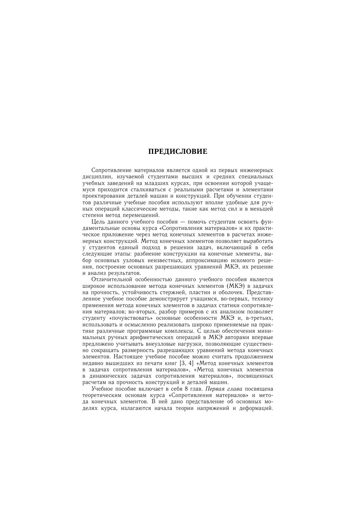 Содержание учебного пособия соответствует программе подготовки специалистов по направлению «Прикладная механика». Излагаются следующие главы курса «Сопротивление материалов»: растяжение–сжатие, кручение, изгиб, растяжение–сжатие с кручением, косой изгиб, косой изгиб в сочетании с растяжением–сжатием, с растяжением–сжатием и кручением, теория напряженного и деформированного состояний, пластины, толстостенные трубы и тонкостенные оболочки. Каждая глава учебного пособия включает основные положения теории и расчетные формулы. Отличительная особенность пособия — широкое использование метода конечных элементов (МКЭ). Подробно рассмотрены решения на основе МКЭ большого количества задач сопротивления материалов.