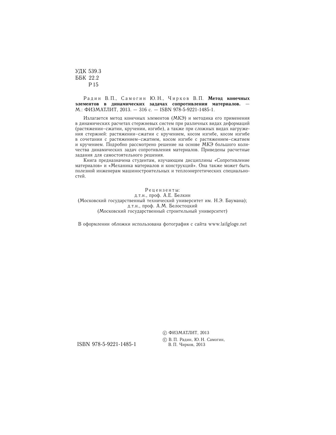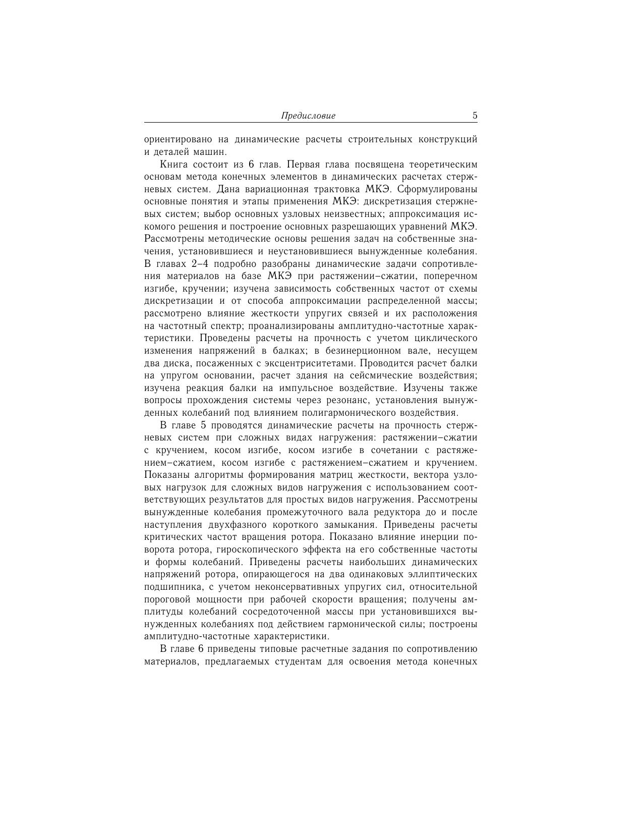 Излагается метод конечных элементов (МКЭ) и методика его применения в динамических расчетах стержневых систем при различных видах деформаций (растяжении–сжатии, кручении, изгибе), а также при сложных видах нагружения стержней: растяжении–сжатии с кручением, косом изгибе, косом изгибе в сочетании с растяжением–сжатием, косом изгибе с растяжением–сжатием и кручением. Подробно рассмотрено решение на основе МКЭ большого количества динамических задач сопротивления материалов. Приведены расчетные задания для самостоятельного решения. Книга предназначена студентам, изучающим дисциплины «Сопротивление материалов» и «Механика материалов и конструкций». Она также может быть полезной инженерам машиностроительных и теплоэнергетических специальностей.