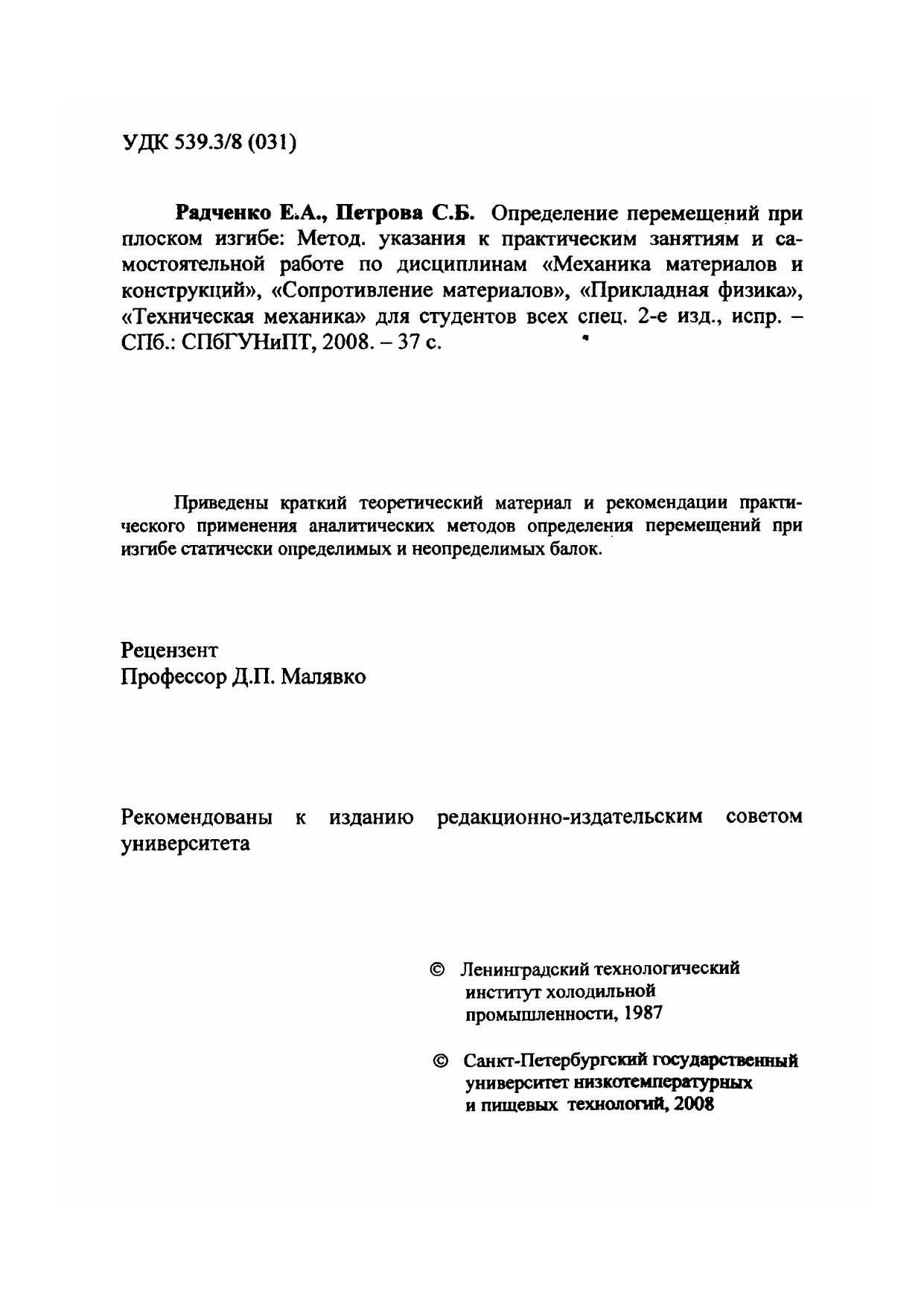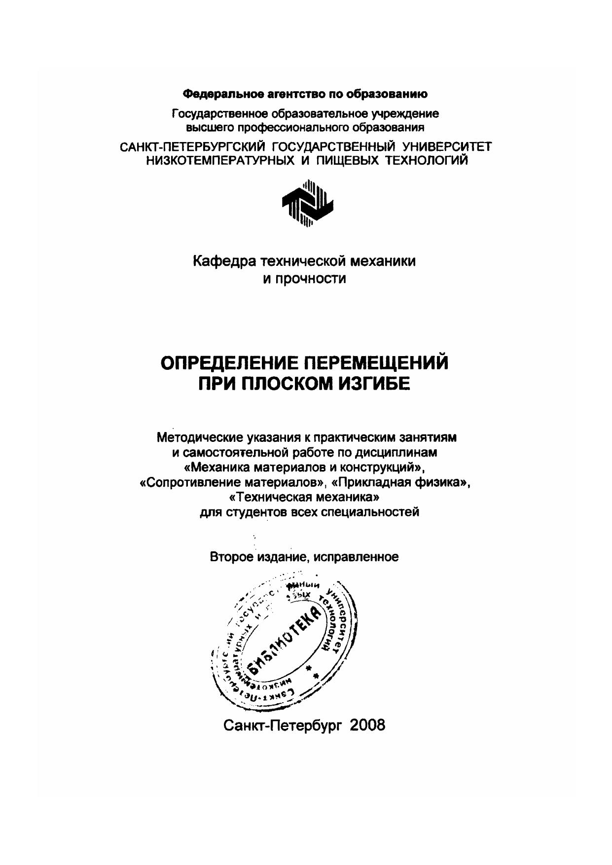 Определение перемещений при плоском изгибе: Метод, указания к практическим занятиям и самостоятельной работе