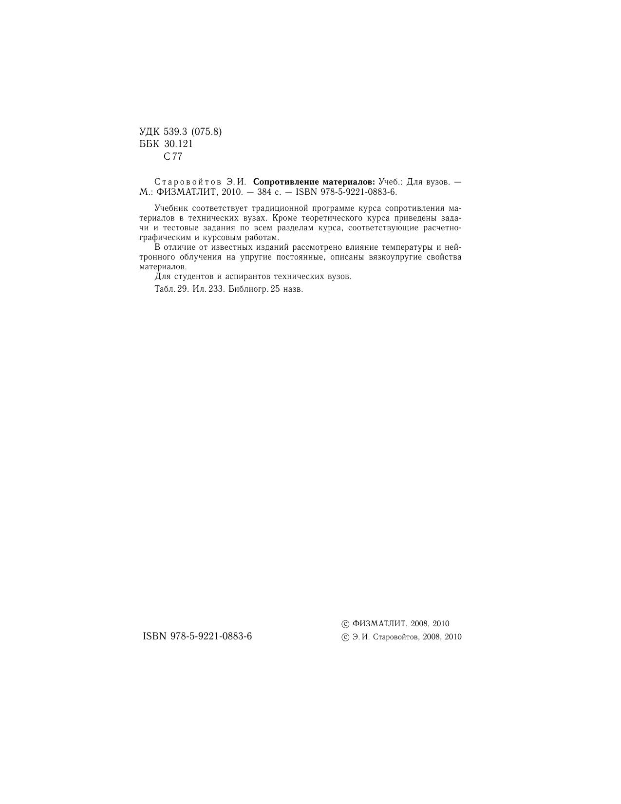 Учебник соответствует традиционной программе курса сопротивления материалов в технических вузах. Приведены тестовые задания по всем разделам курса. Изложены методы и примеры решения задач. Для студентов и аспирантов.