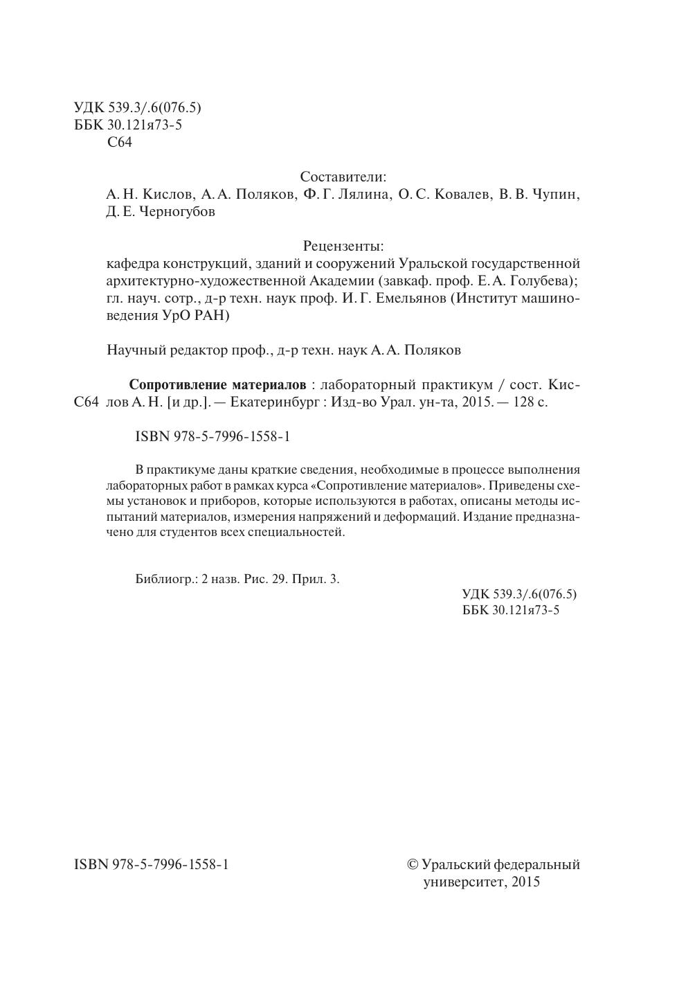 В практикуме даны краткие сведения, необходимые в процессе выполнения лабораторных работ в рамках курса «Сопротивление материалов». Приведены схемы установок и приборов, которые используются в работах, описаны методы испытаний материалов, измерения напряжений и деформаций. Издание предназначено для студентов всех специальностей.