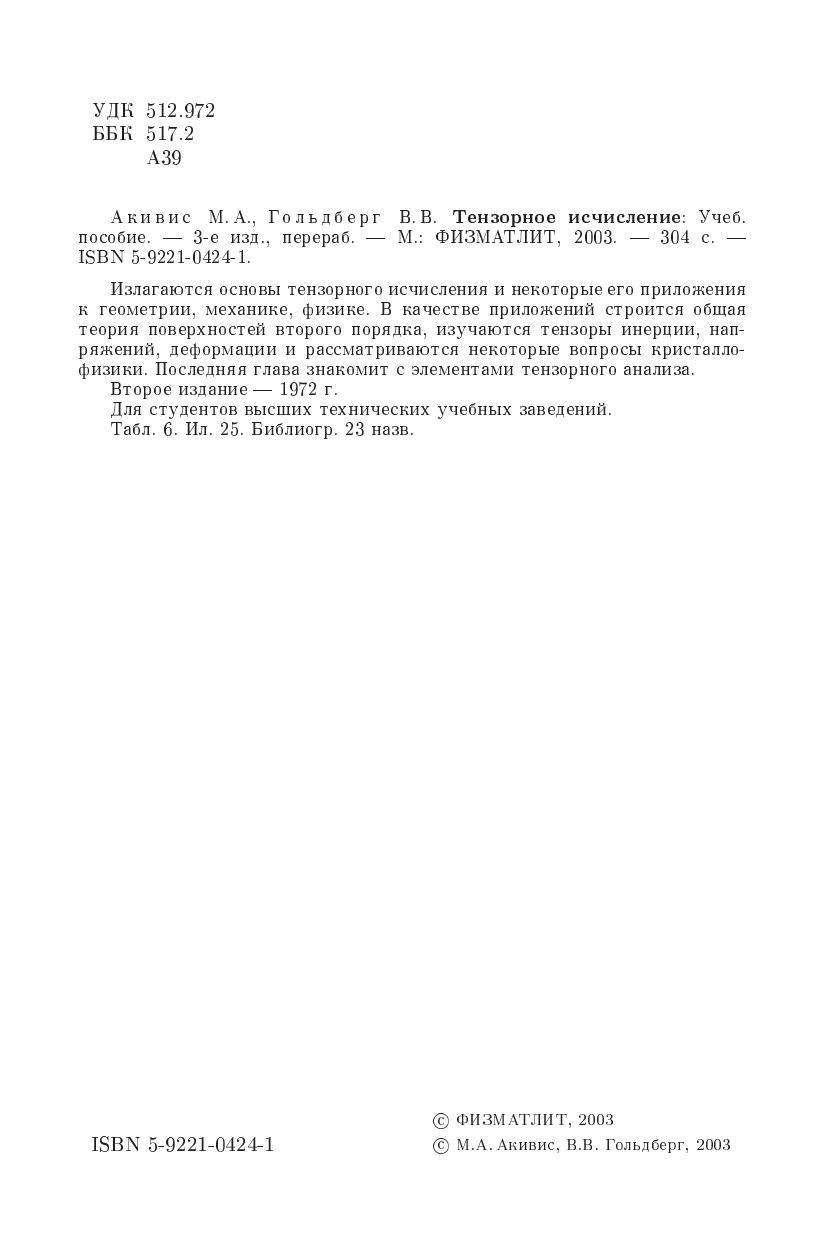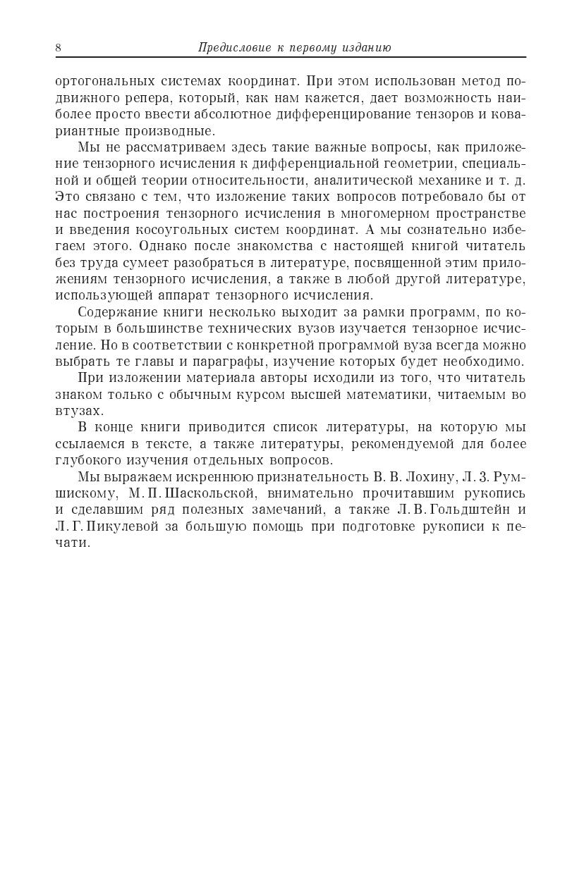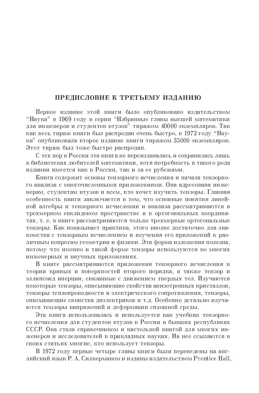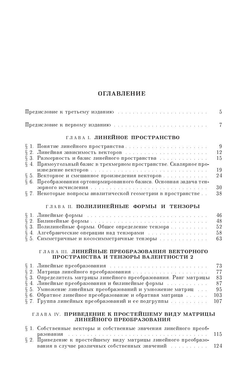 Излагаются основы тензорного исчисления и некоторые его приложения к геометрии, механике, физике. В качестве приложения строится общая теория поверхностей второго порядка, изучаются тензоры инерции, напряжений, деформации и рассматриваются некоторые вопросы кристаллофизики. Последняя глава знакомит с элементами тензорного анализа.