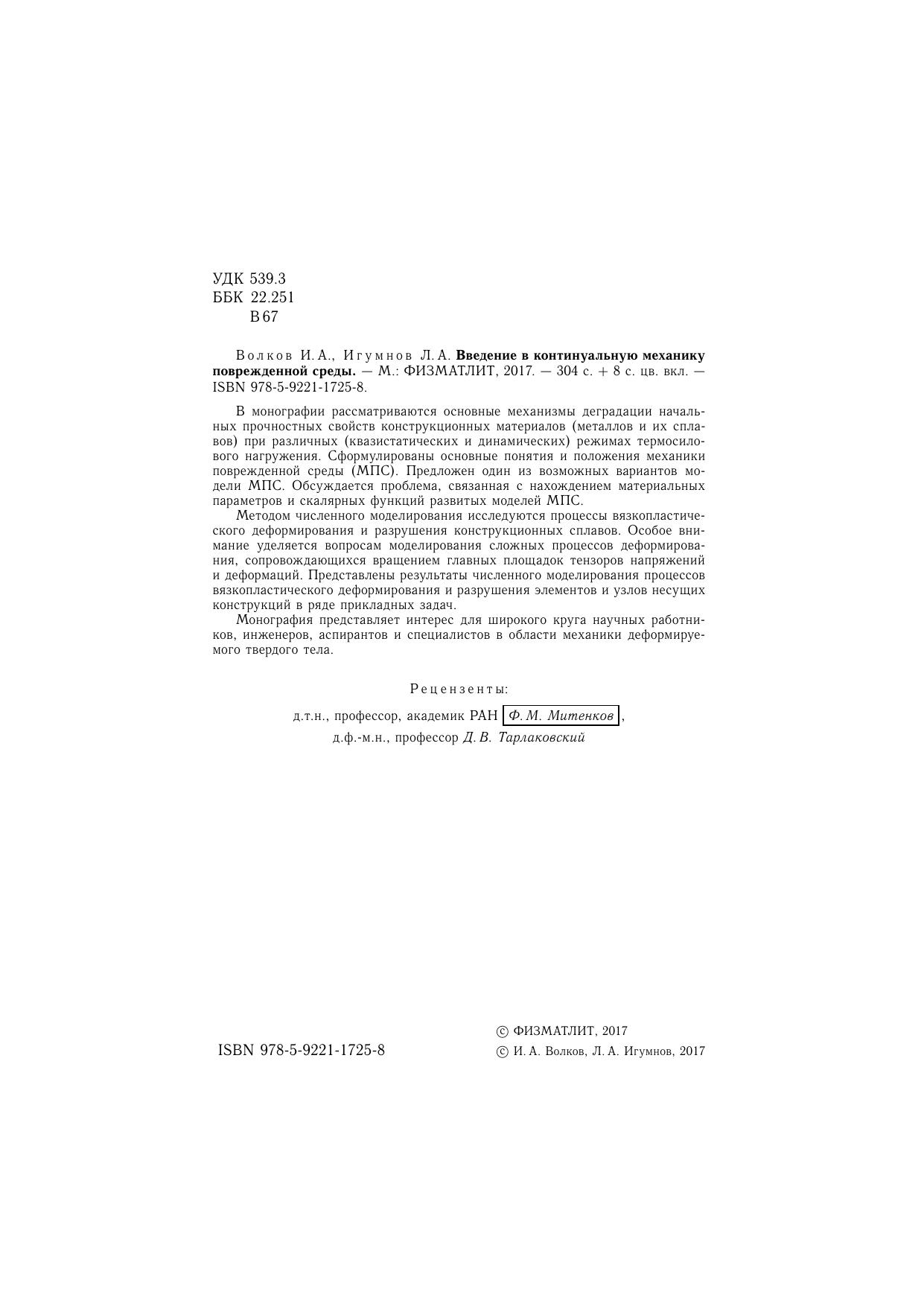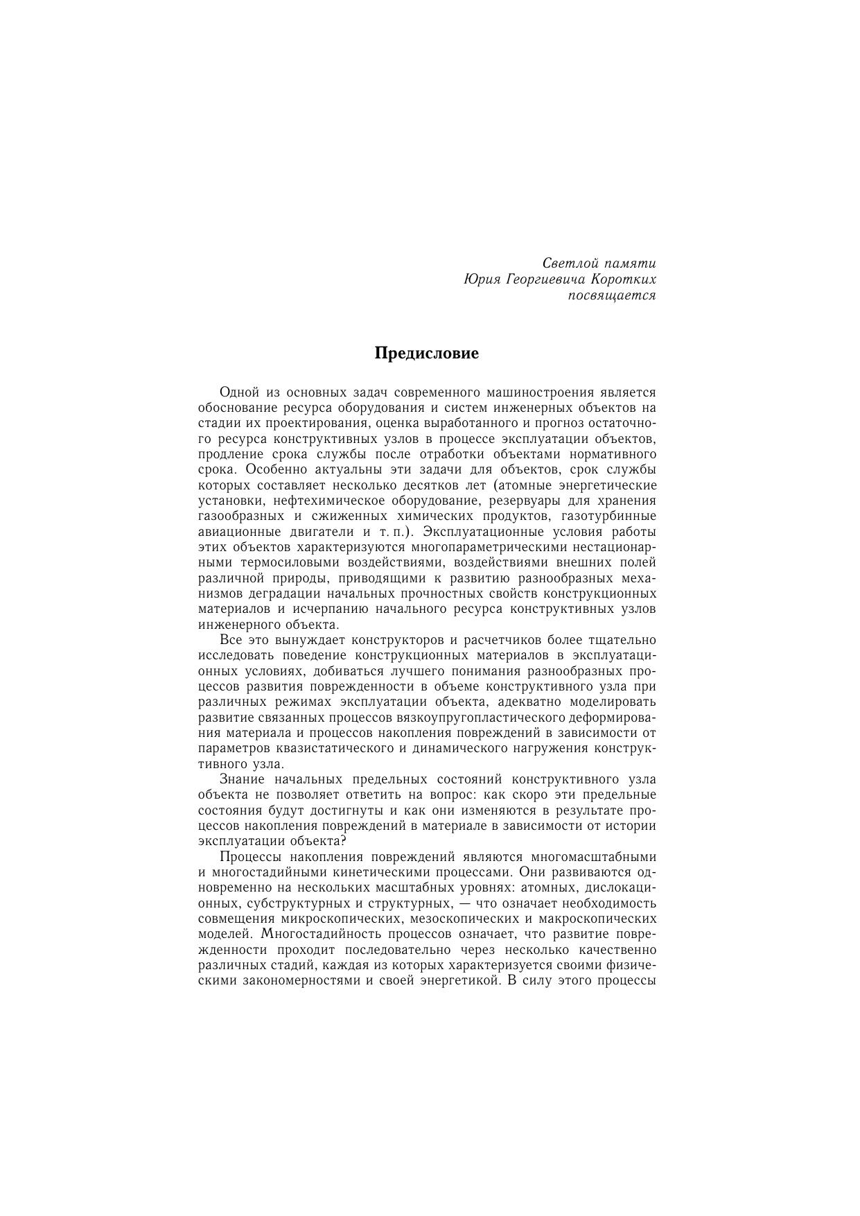 В монографии рассматриваются основные механизмы деградации начальных прочностных свойств конструкционных материалов (металлов и их сплавов) при различных (квазистатических и динамических) режимах термосилового нагружения. Сформулированы основные понятия и положения механики поврежденной среды (МПС). Предложен один из возможных вариантов модели МПС. Обсуждается проблема, связанная с нахождением материальных параметров и скалярных функций развитых моделей МПС. Методом численного моделирования исследуются процессы вязкопластического деформирования и разрушения конструкционных сплавов. Особое внимание уделяется вопросам моделирования сложных процессов деформирования, сопровождающихся вращением главных площадок тензоров напряжений и деформаций. Представлены результаты численного моделирования процессов вязкопластического деформирования и разрушения элементов и узлов несущих конструкций в ряде прикладных задач. Монография представляет интерес для широкого круга научных работников, инженеров, аспирантов и специалистов в области механики деформируемого твердого тела.