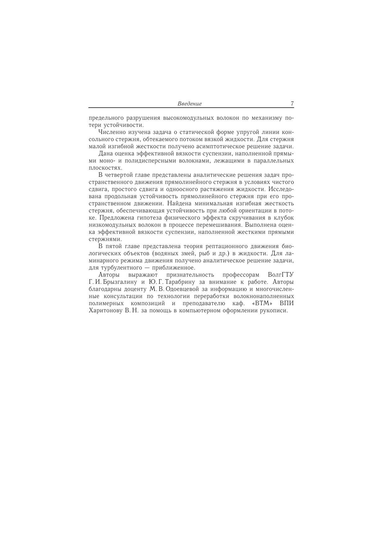 Выведены уравнения движения искривленного стержня конечной длины в потоке вязкой жидкости. Получено аналитическое решение задач движения прямолинейного стержня в условиях чистого сдвига, простого сдвига и одноосного растяжения жидкости. Исследована продольная устойчивость прямолинейного стержня при его пространственном движении в потоке вязкой жидкости. Найдена минимальная жесткость стержня, обеспечивающая устойчивость при любой ориентации в потоке. Выполнена оценка эффективной вязкости суспензии, наполненной жесткими прямыми стержнями. Представлена задача рептационного движения животных в жидкости. Для специалистов по механике, преподавателей, аспирантов и студентовуниверситетов, занимающихся вопросами бионики, а также переработки волокнонаполненных полимеров.