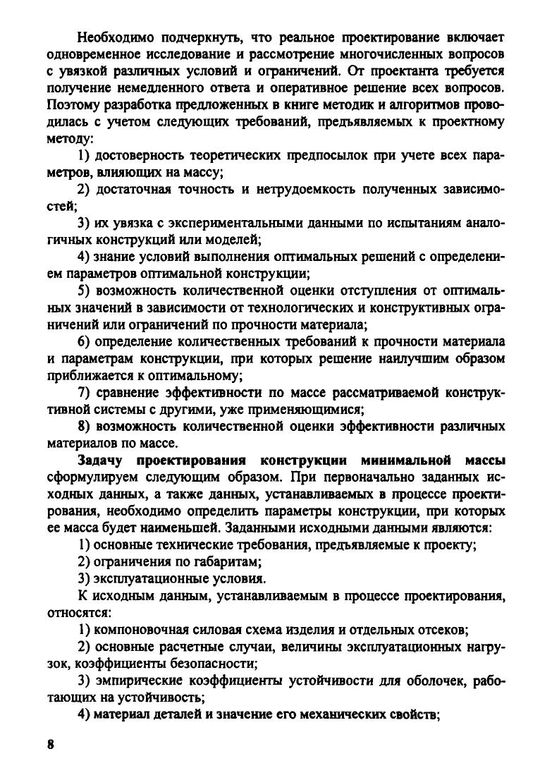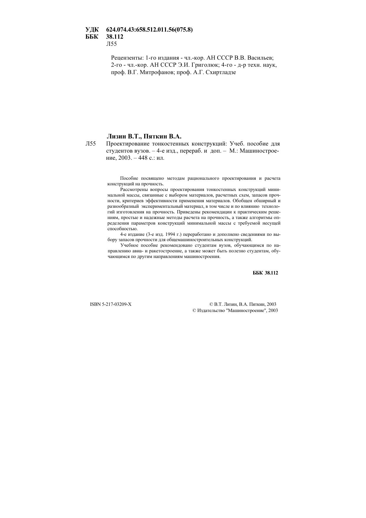 Пособие посвящено методам рационального проектирования и расчета конструкций на прочность. Рассмотрены вопросы проектирования тонкостенных конструкций минимальной массы, связанные с выбором материалов, расчетных схем, запасов прочности, критериев эффективности применения материалов. Обобщен обширный и разнообразный экспериментальный материал, в том числе и по влиянию технологий изготовления на прочность. Приведены рекомендации к практическим решениям, простые и надежные методы расчета на прочность, а также алгоритмы определения параметров конструкций минимальной массы с требуемой несущей способностью. 4-е издание (3-е изд. 1994 г.) переработано и дополнено сведениями по выбору запасов прочности для общемашиностроительных конструкций. Учебное пособие рекомендовано студентам вузов, обучающимся по направлению авиа- и ракетостроение, а также может быть полезно студентам, обучающимся по другим направлениям машиностроения.