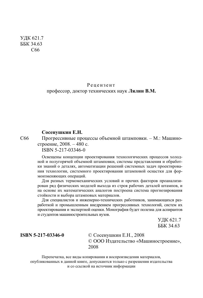 Освещены концепции проектирования технологических процессов холодной и полугорячей объемной штамповки, системы представления и обработки знаний о деталях, автоматизации решений системных задач проектирования технологии, системного проектирования штамповой оснастки для формоизменяющих операций. Для разных термомеханических условий и прочих факторов проанализирован ряд физических моделей выхода из строя рабочих деталей штампов, и на основе их математических аналогов построена система прогнозирования стойкости и выбора штамповых материалов. Для специалистов и инженерно-технических работников, занимающихся разработкой и промышленным внедрением прогрессивных технологий, систем их проектирования и экспертной оценки. Монография будет полезна для аспирантов и студентов машиностроительных вузов.