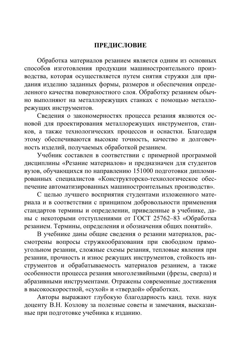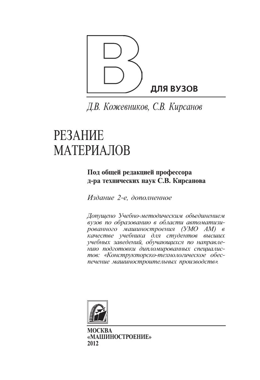 Рассмотрены общие сведения о резании материалов, вопросы стружкообразования, сложные схемы резания, тепловые явления, прочность, износ и стойкость инструментов, обрабатываемость материалов резанием и особенности процесса резания многолезвийными и абразивными инструментами. Для студентов машиностроительных специальностей технических вузов и инженерно-технических работников машиностроительных производств.