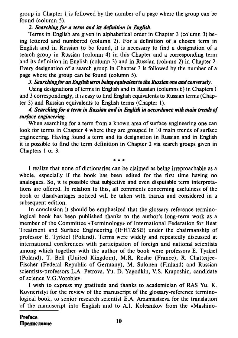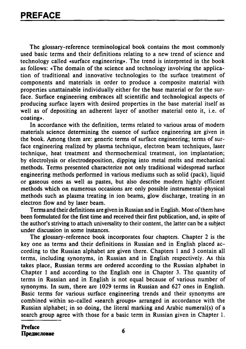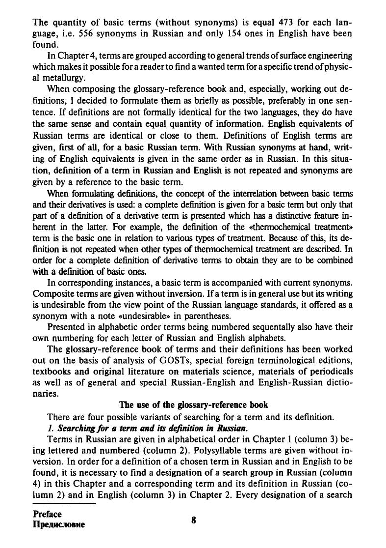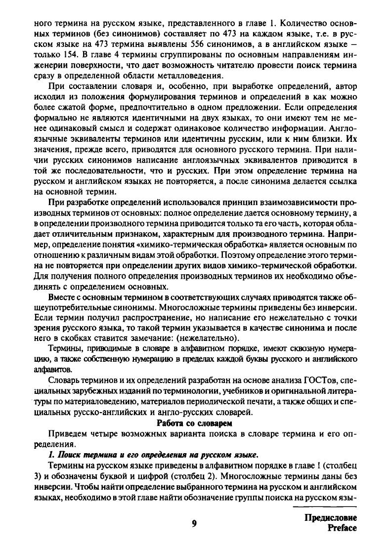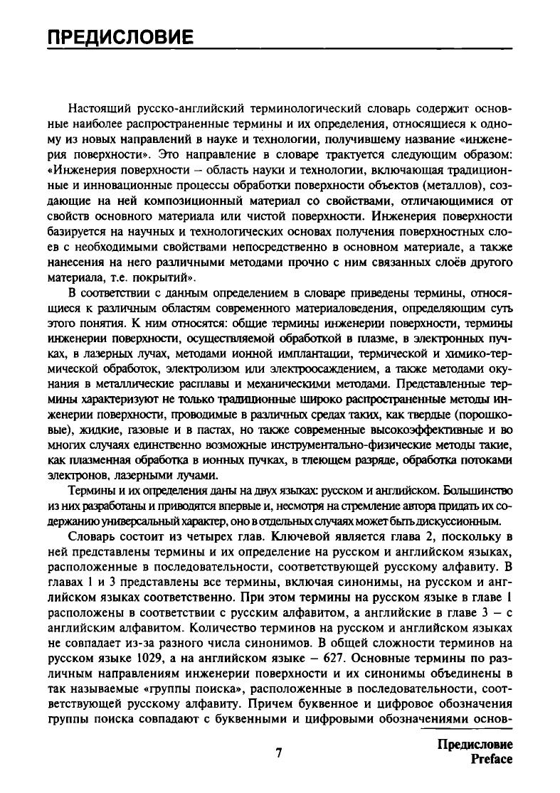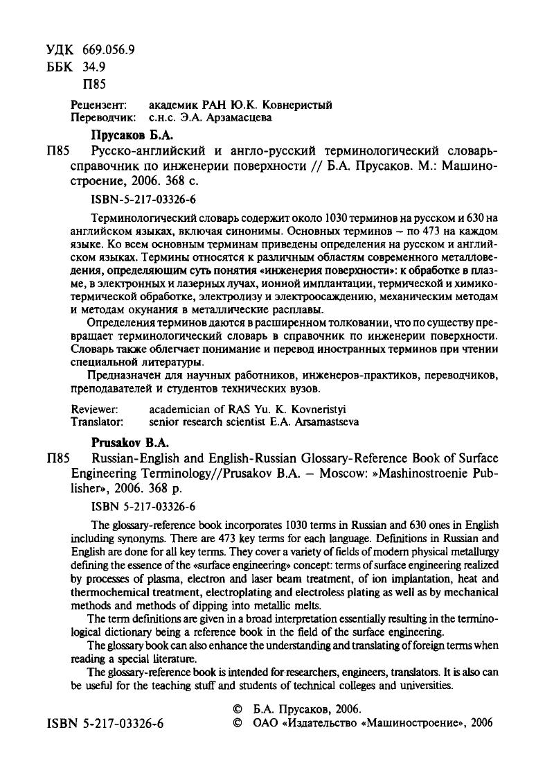 Терминологический словарь содержит около 1030 терминов на русском и 630 на английском языках, включая синонимы. Основных терминов – по 473 на каждом языке. Ко всем основным терминам приведены определения на русском и английском языках. Термины относятся к различным областям современного металловедения, определяющим суть понятия «инженерия поверхности»: к обработке в плазме, в электронных и лазерных лучах, ионной имплантации, термической и химико-термической обработке, электролизу и электроосаждению, механическим методам и методам окунания в металлические расплавы. Определения терминов даются в расширенном толковании, что по существу превращает терминологический словарь в справочник по инженерии поверхности. Словарь также облегчает понимание и перевод иностранных терминов при чтении специальной литературы.Предназначен для научных работников, инженеров-практиков, переводчиков, преподавателей и студентов технических вузов.