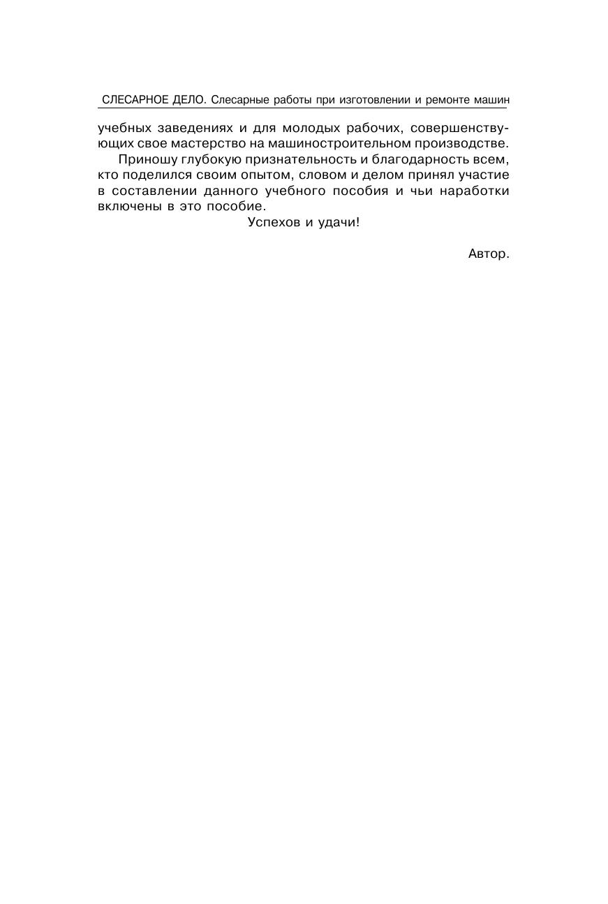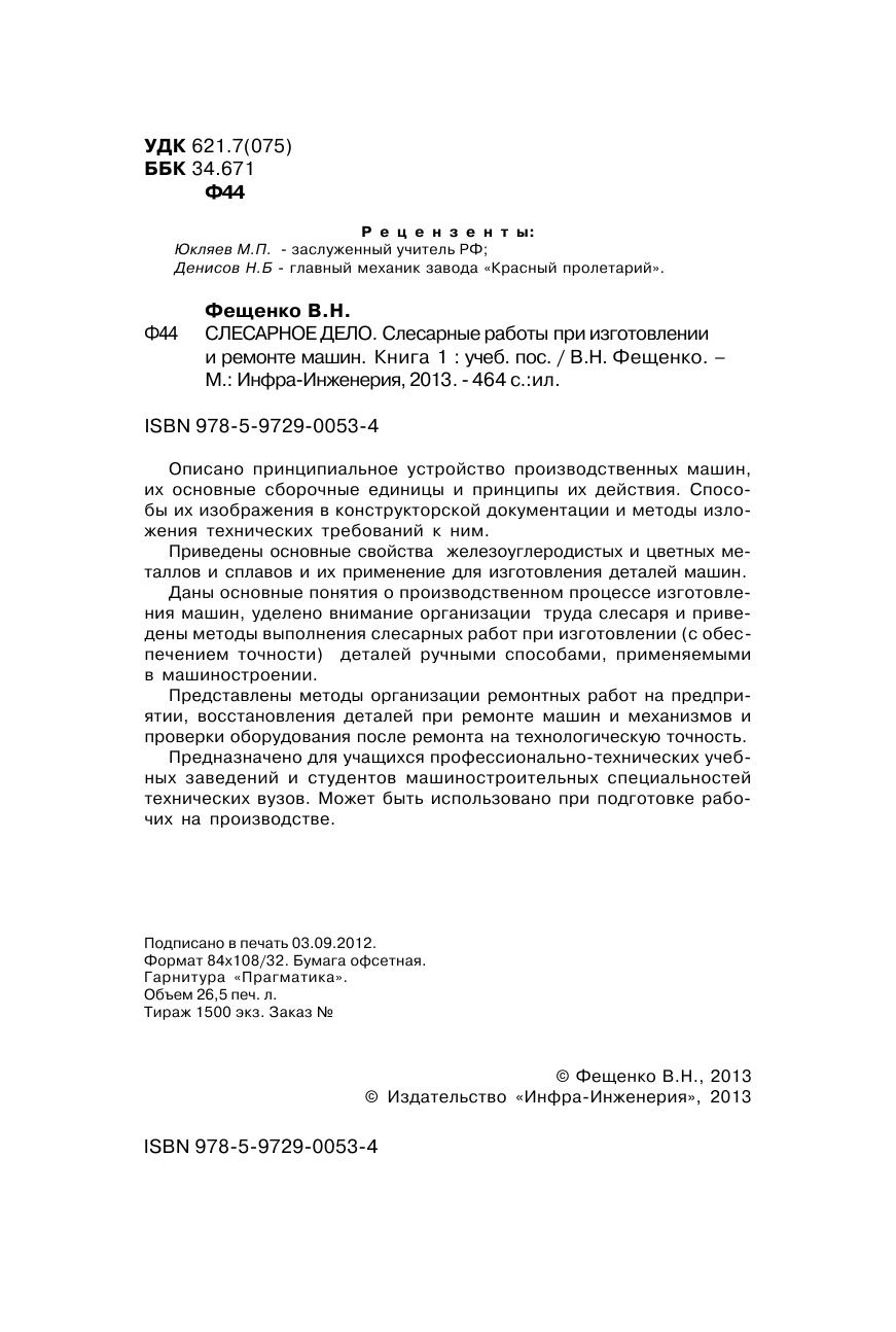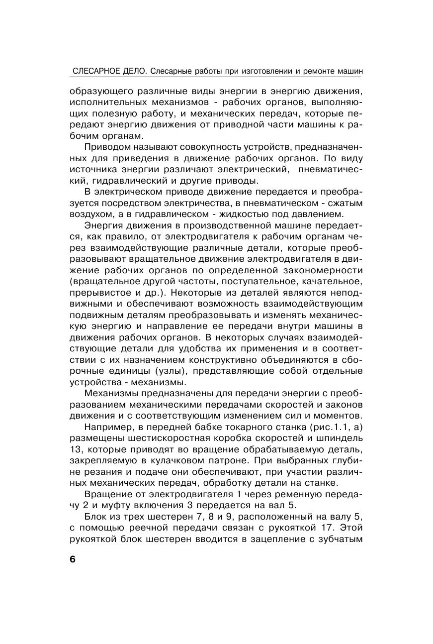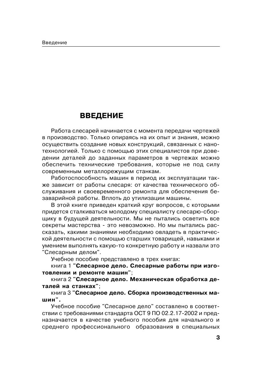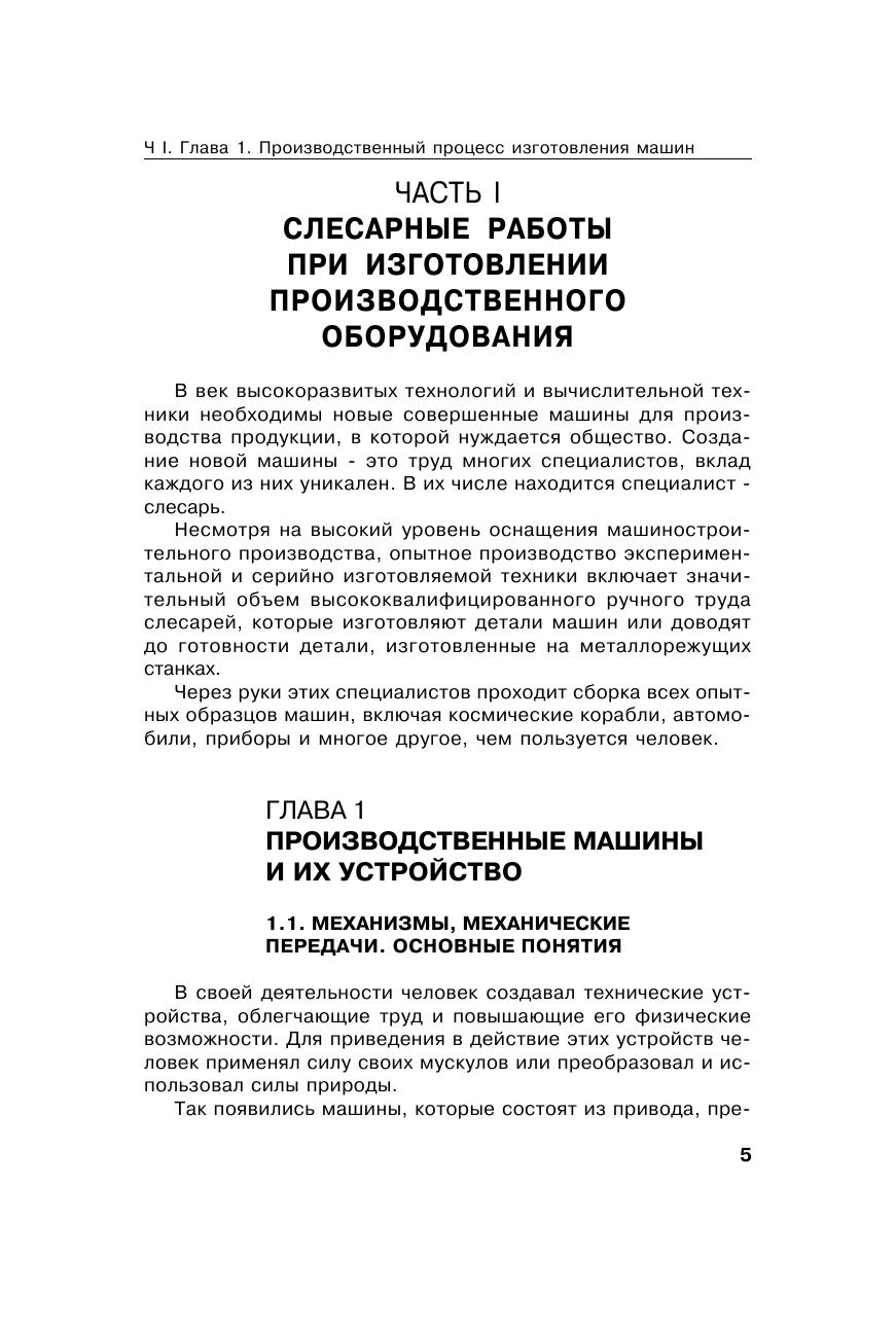 Описано принципиальное устройство производственных машин, их основные сборочные единицы и принципы их действия. Способы их изображения в конструкторской документации и методы изложения технических требований к ним. Приведены основные свойства железоуглеродистых и цветных металлов и сплавов и их применение для изготовления деталей машин. Даны основные понятия о производственном процессе изготовления машин, уделено внимание организации труда слесаря и приведены методы выполнения слесарных работ при изготовлении (с обеспечением точности) деталей ручными способами, применяемыми в машиностроении. Представлены методы организации ремонтных работ на предприятии, восстановления деталей при ремонте машин и механизмов и проверки оборудования после ремонта на технологическую точность. Предназначено для учащихся профессионально-технических учебных заведений и студентов машиностроительных специальностей технических вузов. Может быть использовано при подготовке рабочих на производстве.