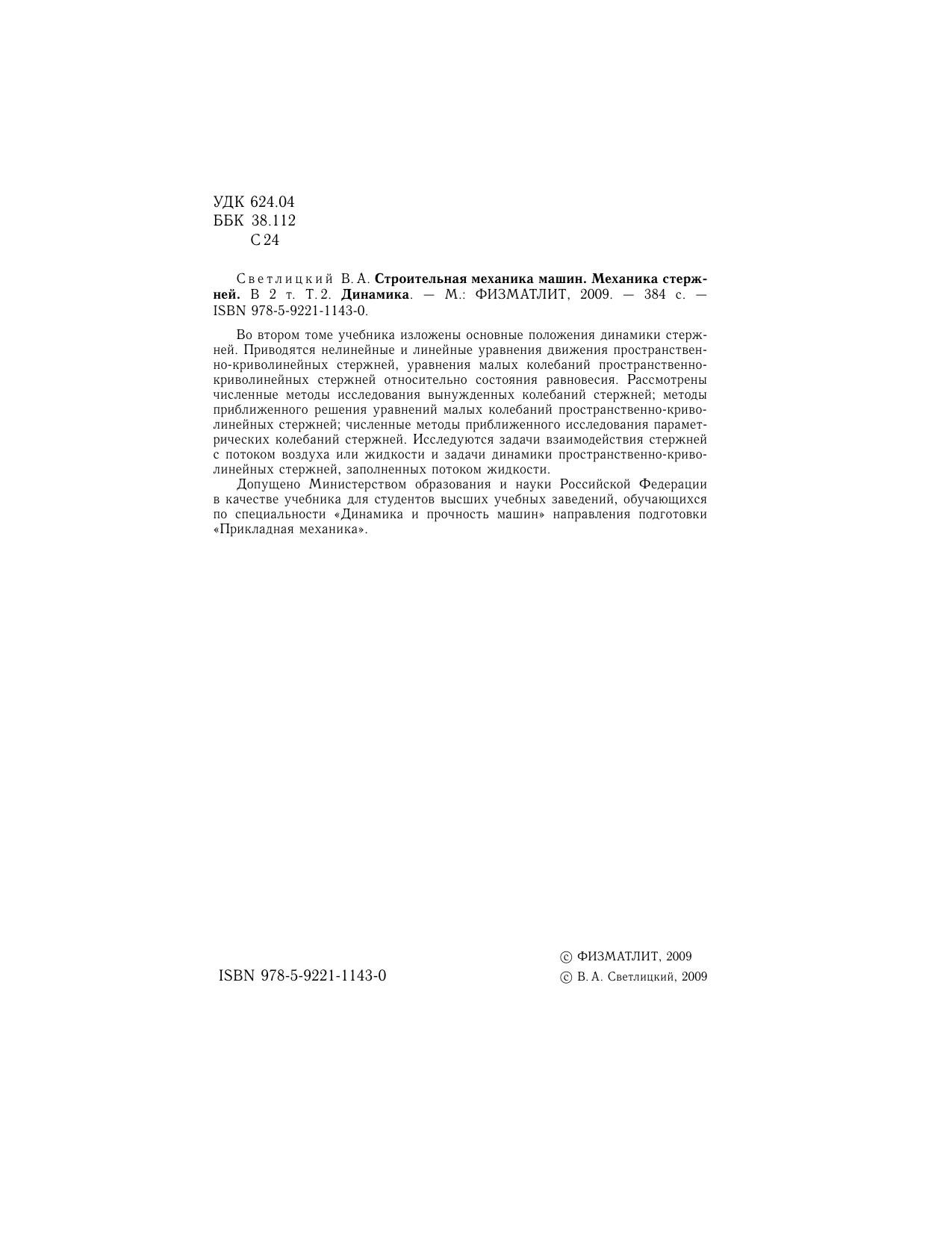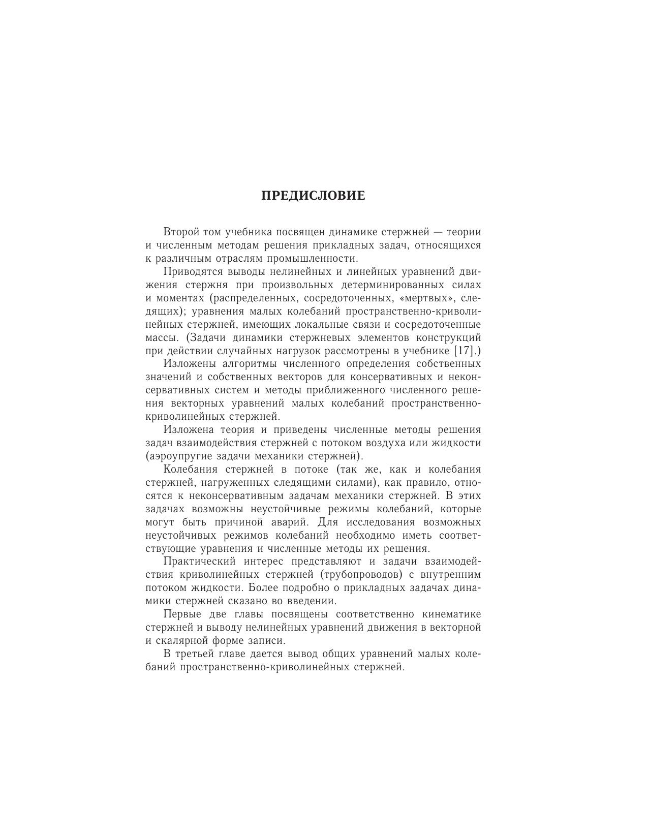 Во втором томе учебника изложены основные положения динамики стержней. Приводятся нелинейные и линейные уравнения движения пространственно-криволинейных стержней, уравнения малых колебаний пространственно-криволинейных стержней относительно состояния равновесия. Рассмотрены численные методы исследования вынужденных колебаний стержней методы приближенного решения уравнений малых колебаний пространственно-криволинейных стержней численные методы приближенного исследования параметрических колебаний стержней. Исследуются задачи взаимодействия стержней с потоком воздуха или жидкости и задачи динамики пространственно-криволинейных стержней, заполненных потоком жидкости.
