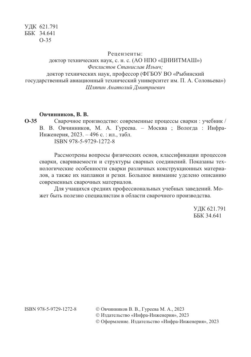Рассмотрены вопросы физических основ, классификации процессов сварки, свариваемости и структуры сварных соединений. Показаны технологические особенности сварки различных конструкционных материалов, а также их наплавки и резки. Большое внимание уделено описанию современных сварочных материалов.