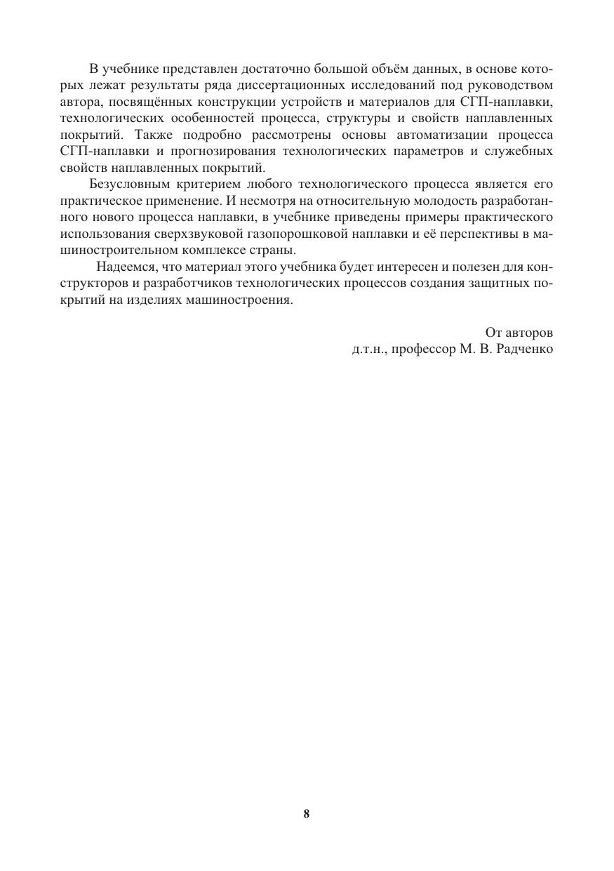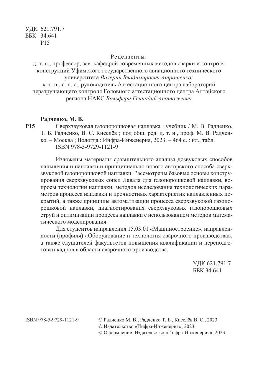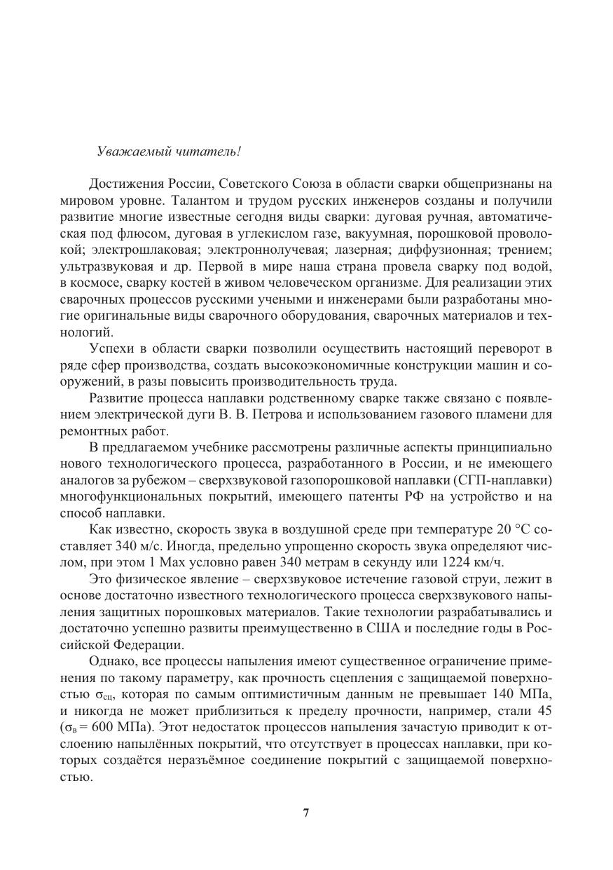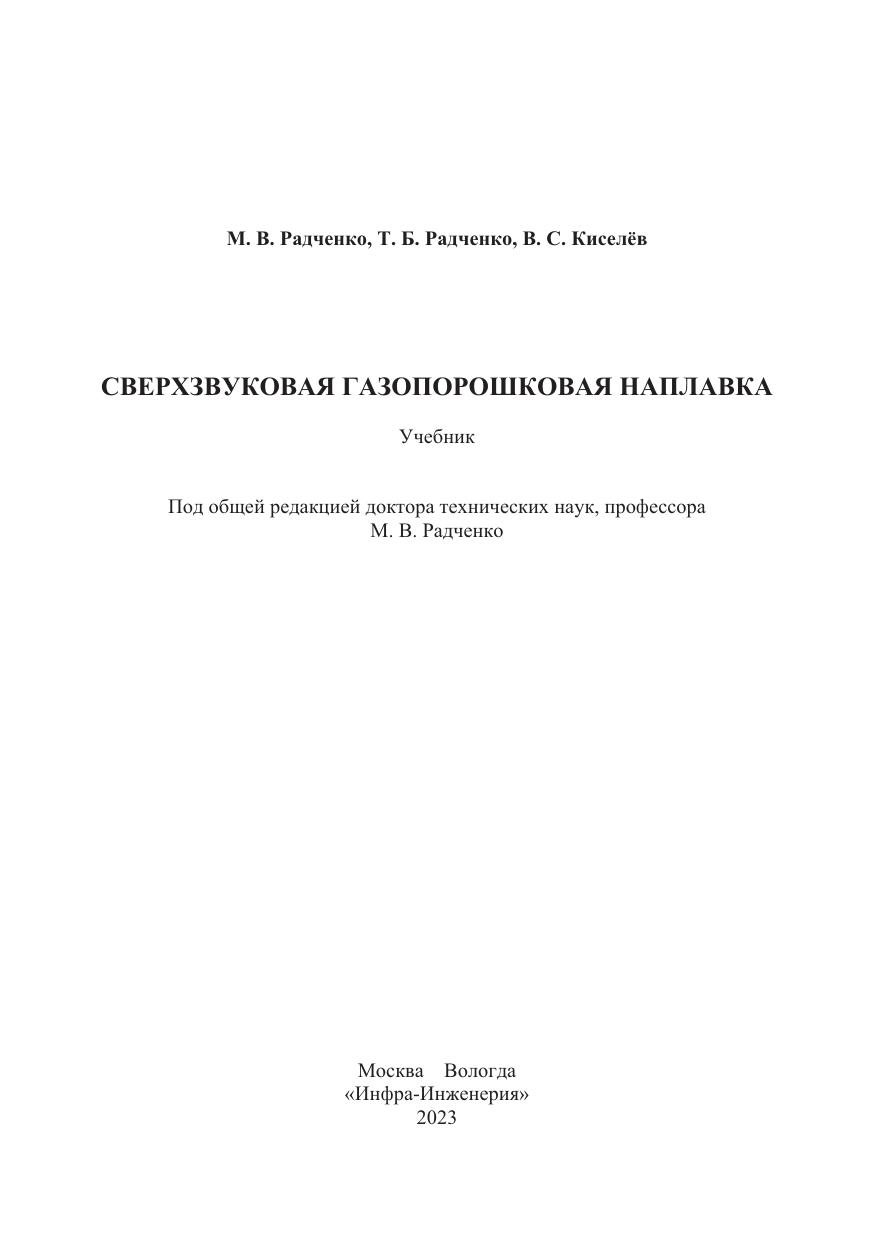 Изложены материалы сравнительного анализа дозвуковых способов напыления и наплавки и принципиально нового авторского способа сверхзвуковой газопорошковой наплавки. Рассмотрены базовые основы конструирования сверхзвуковых сопел Лаваля для газопорошковой наплавки, вопросы технологии наплавки, методов исследования технологических параметров процесса наплавки и прочностных характеристик наплавленных покрытий, а также принципы автоматизации процесса сверхзвуковой газопорошковой наплавки, диагностирования сверхзвуковых газопорошковых струй и оптимизации процесса наплавки с использованием методов математического моделирования.