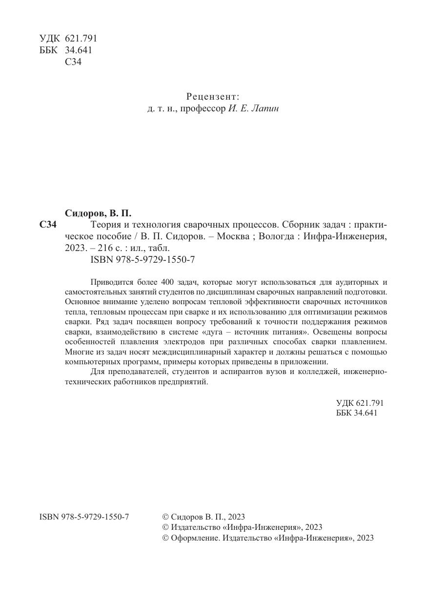 Приводится более 400 задач, которые могут использоваться для аудиторных и самостоятельных занятий студентов по дисциплинам сварочных направлений подготовки. Основное внимание уделено вопросам тепловой эффективности сварочных источников тепла, тепловым процессам при сварке и их использованию для оптимизации режимов сварки. Ряд задач посвящен вопросу требований к точности поддержания режимов сварки, взаимодействию в системе «дуга – источник питания». Освещены вопросы особенностей плавления электродов при различных способах сварки плавлением. Многие из задач носят междисциплинарный характер и должны решаться с помощью компьютерных программ, примеры которых приведены в приложении.