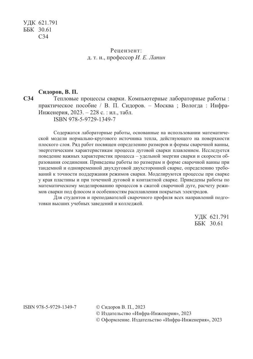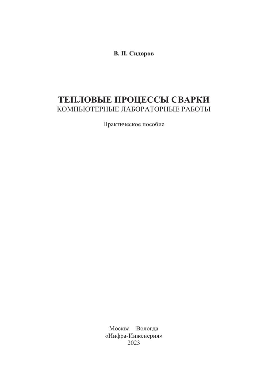 Содержатся лабораторные работы, основанные на использовании математической модели нормально-кругового источника тепла, действующего на поверхности плоского слоя. Ряд работ посвящен определению размеров и формы сварочной ванны, энергетическим характеристикам процесса дуговой сварки плавлением. Исследуется поведение важных характеристик процесса – удельной энергии сварки и скорости образования соединения. Приведены работы по размерам и форме сварочной ванны при тандемной и одновременной двухдуговой двухсторонней сварке, определению требований к точности поддержания режимов сварки. Моделируются процессы при сварке у края пластины и при точечной дуговой и контактной сварке. Приведены работы по математическому моделированию процессов в сжатой сварочной дуге, расчету режимов сварки под флюсом и особенностям расплавления покрытых электродов.