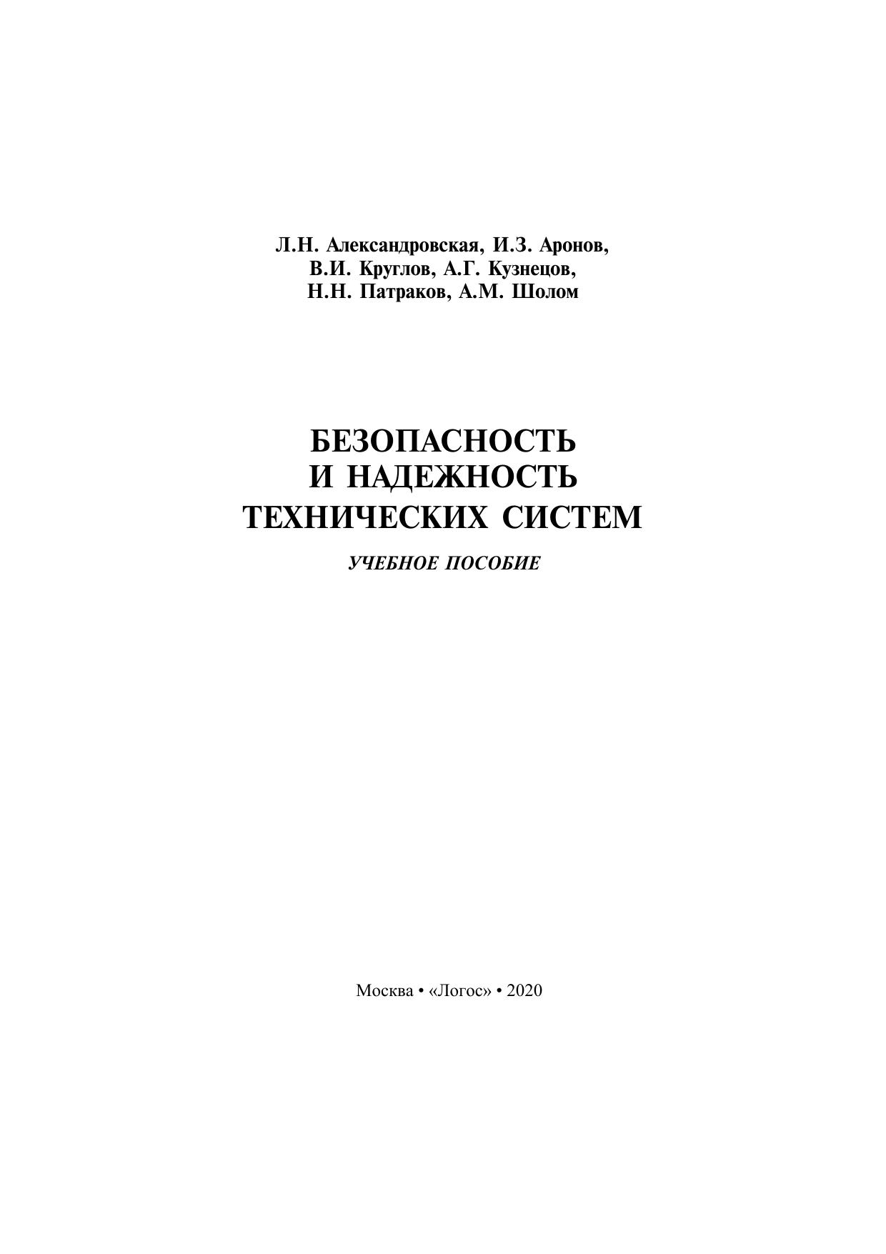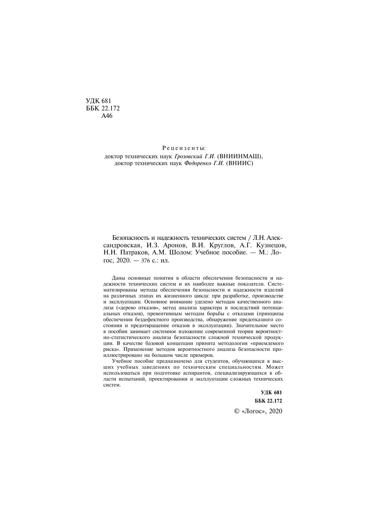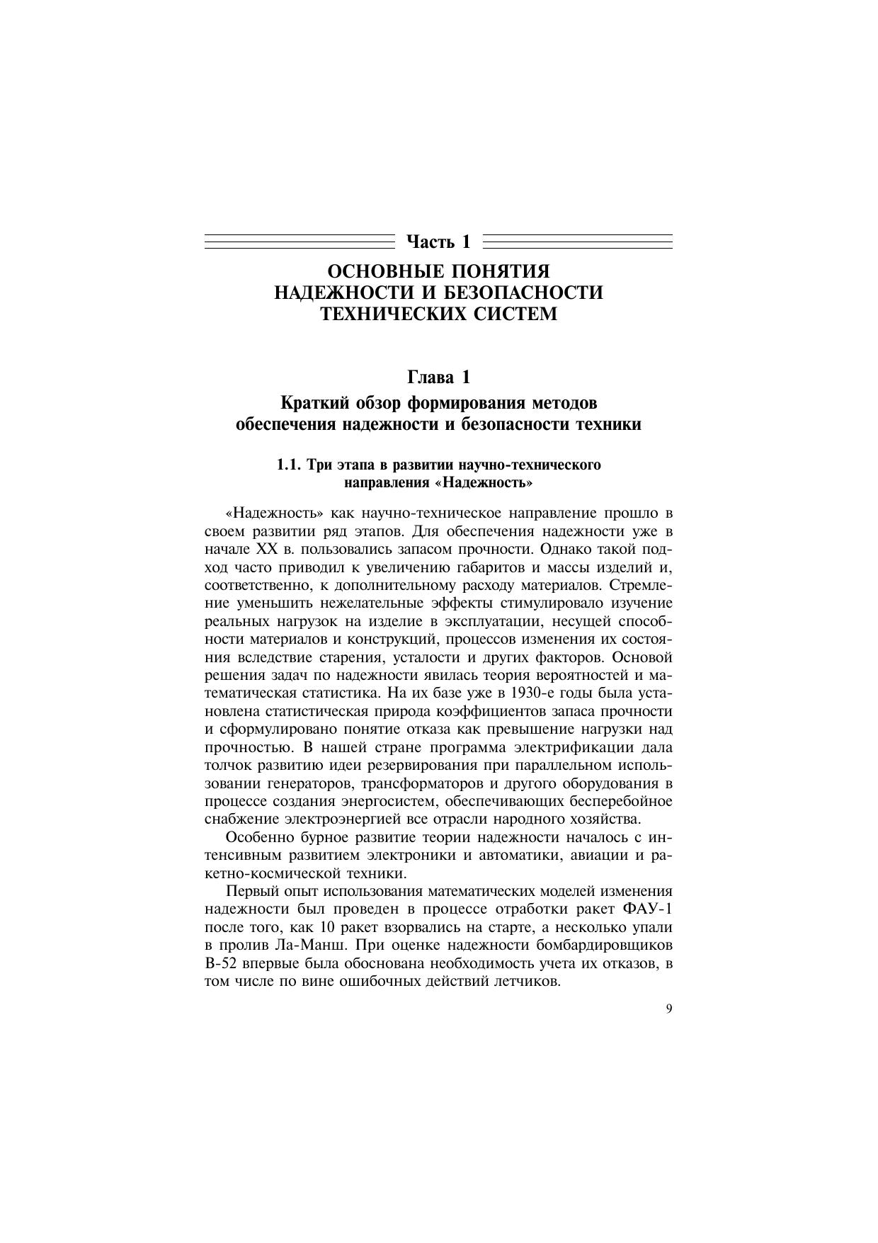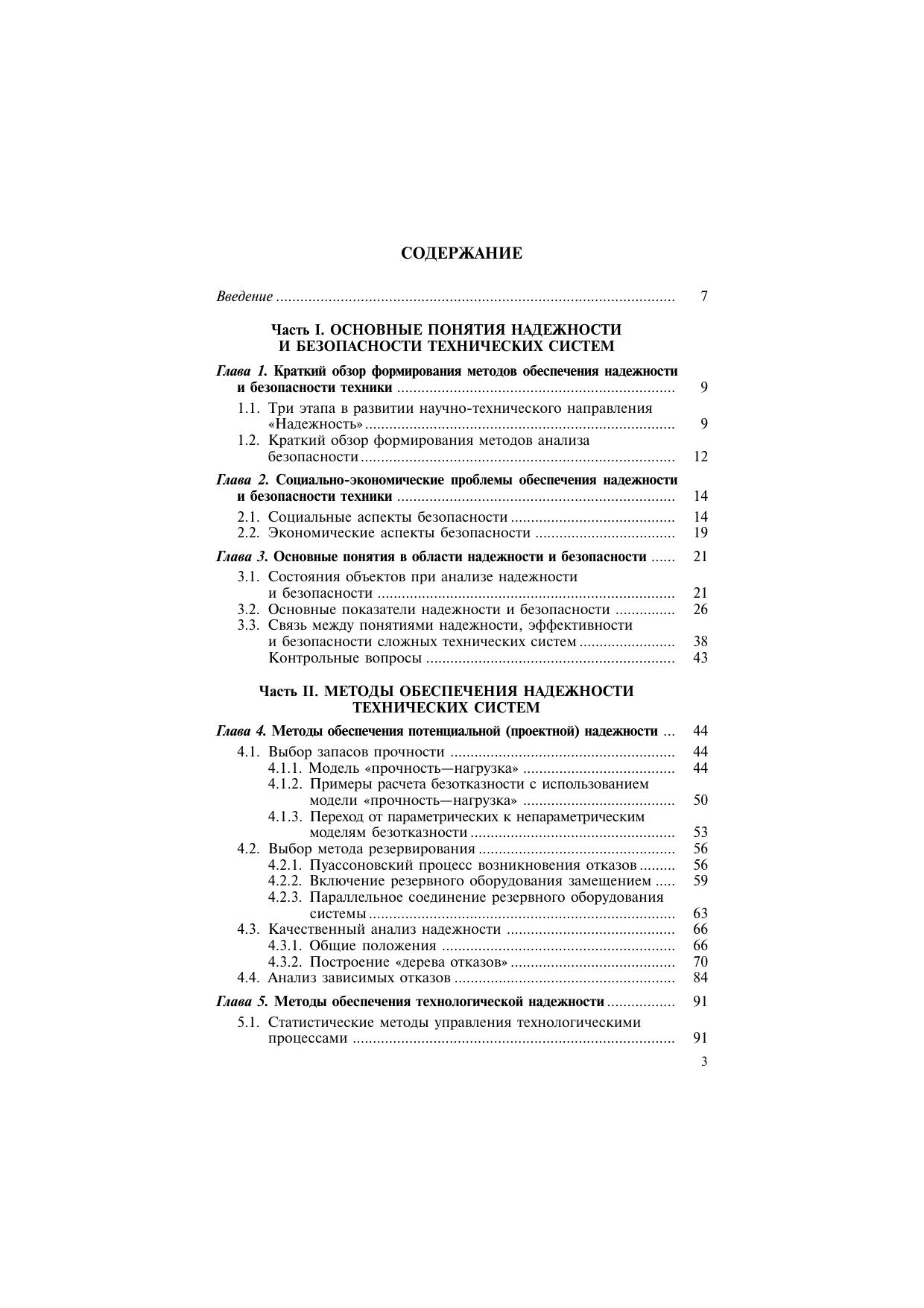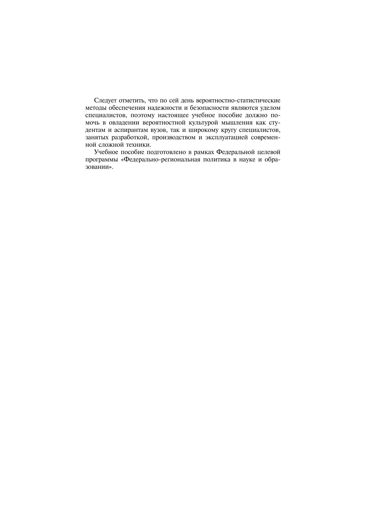 Даны основные понятия в области обеспечения безопасности и надежности технических систем и их наиболее важные показатели. Систематизированы методы обеспечения безопасности и надежности изделий на различных этапах их жизненного цикла: при разработке, производстве и эксплуатации. Основное внимание уделено методам качественного анализа («дерево отказов», метод анализа характера и последствий потенциальных отказов), превентивным методам борьбы с отказами (принципы обеспечения бездефектного производства, обнаружение предотказного состояния и предотвращение отказов в эксплуатации). Значительное место в пособии занимает системное изложение современной теории вероятностно-статистического анализа безопасности сложной технической продукции. В качестве базовой концепции принята методология «приемлемого риска». Применение методов вероятностного анализа безопасности проиллюстрировано на большом числе примеров. Учебное пособие предназначено для студентов, обучающихся в высших учебных заведениях по техническим специальностям. Может использоваться при подготовке аспирантов, специализирующихся в области испытаний, проектирования и эксплуатации сложных технических систем.