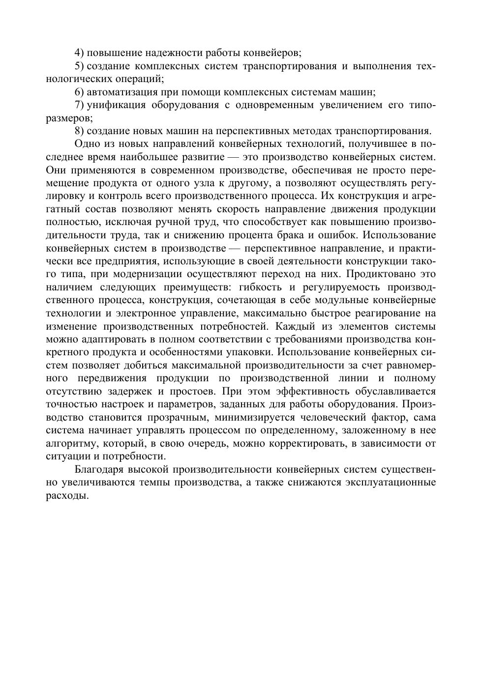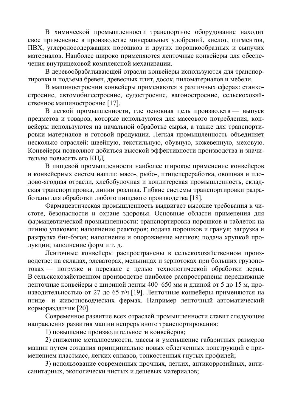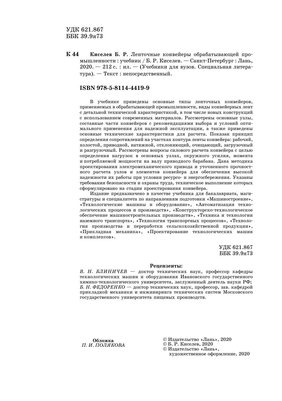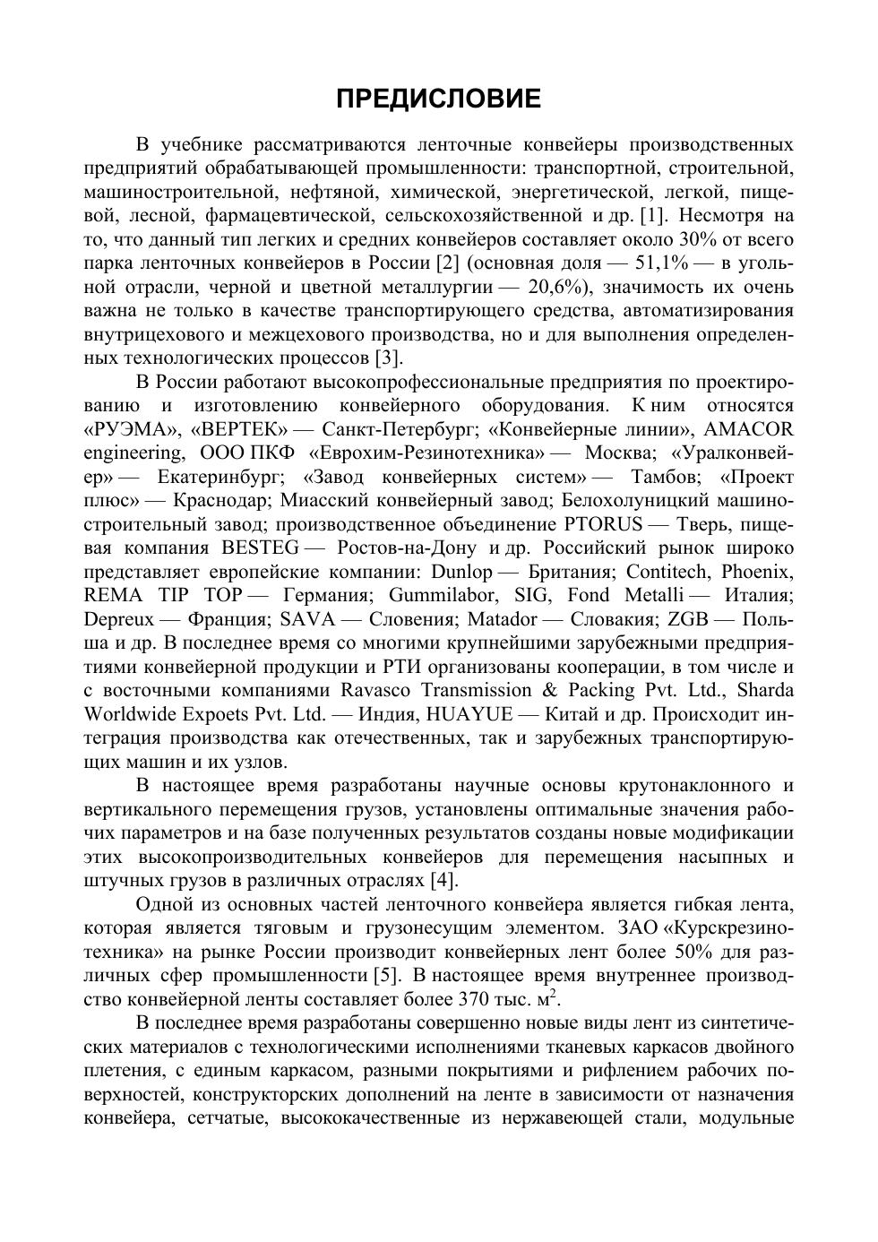 В учебнике приведены основные типы ленточных конвейеров, применяемых в обрабатывающей промышленности, виды конвейерных лент с детальной технической характеристикой, в том числе новых конструкций с использованием современных материалов. Рассмотрены основные узлы, составные части конвейеров с рекомендациями выбора и условий оптимального применения для надежной эксплуатации, а также приведены основные технические характеристики для расчета. Показан принцип определения сопротивлений на участках контура ленты конвейера: рабочий, холостой, приводной, натяжной, отклоняющий, очищающий, загрузочный и разгрузочный. Рассмотрены вопросы силового расчета конвейера с целью определения нагрузок в основных узлах, окружного усилия, момента и потребляемой мощности на валу приводного барабана. Дана методика проектирования электромеханического привода и уточненного прочностного расчета узлов и элементов конвейера для обеспечения высокой надежности их работы при условии ресурсо- и энергосбережения. Указаны требования безопасности и охраны труда, техническое выполнение которых сформулировано на стадии проектирования конвейера.