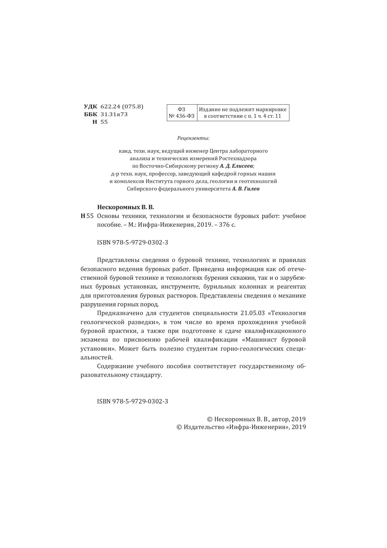 Представлены сведения о буровой технике, технологиях и правилах безопасного ведения буровых работ. Приведена информация как об отечественной буровой технике и технологиях бурения скважин, так и о зарубежных буровых установках, инструменте, бурильных колоннах и реагентах для приготовления буровых растворов. Представлены сведения о механике разрушения горных пород.